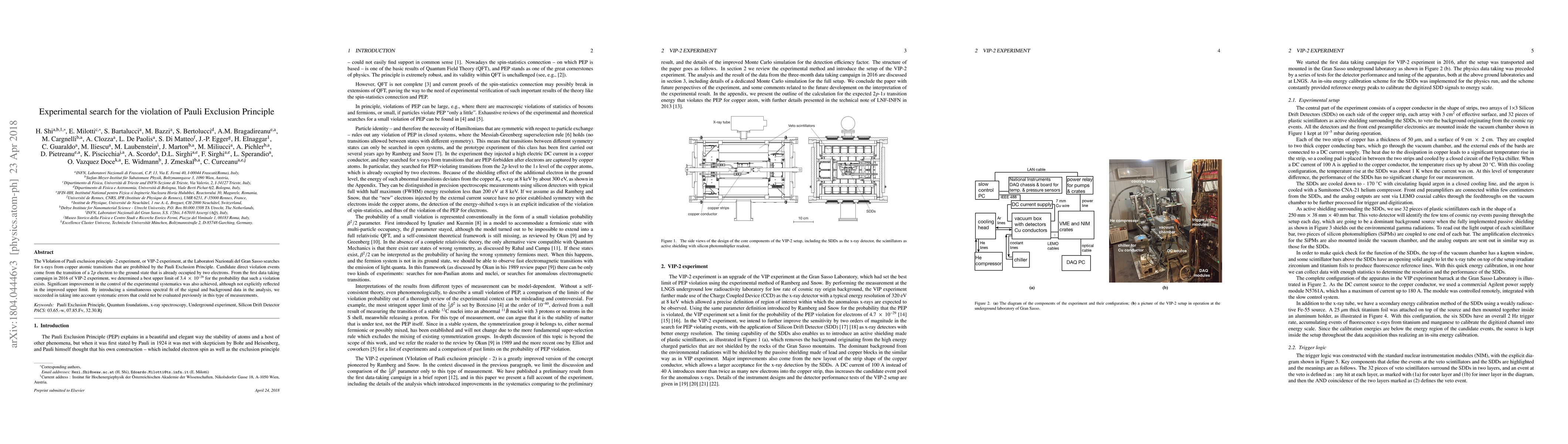The VIP-2 experiment at Laboratori Nazionali del Gran Sasso investigates potential violations of the Pauli Exclusion Principle by searching for x-rays from copper atomic transitions that should be forbidden. The experiment set an upper limit of 3.4 × 10^-29 for the probability of such a violation, with significant improvements in systematic error control.