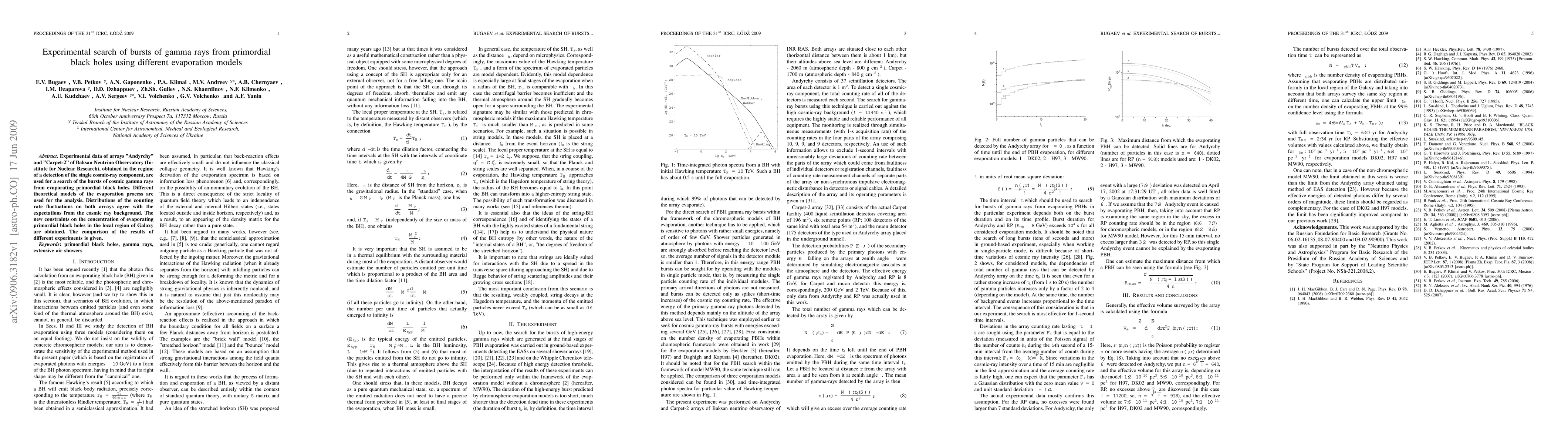 This paper analyzes experimental data from the Baksan Neutrino Observatory to search for gamma-ray bursts from evaporating primordial black holes using different theoretical evaporation models. The results show no significant deviations from cosmic ray background, leading to new constraints on the concentration of such black holes in the local Galaxy.