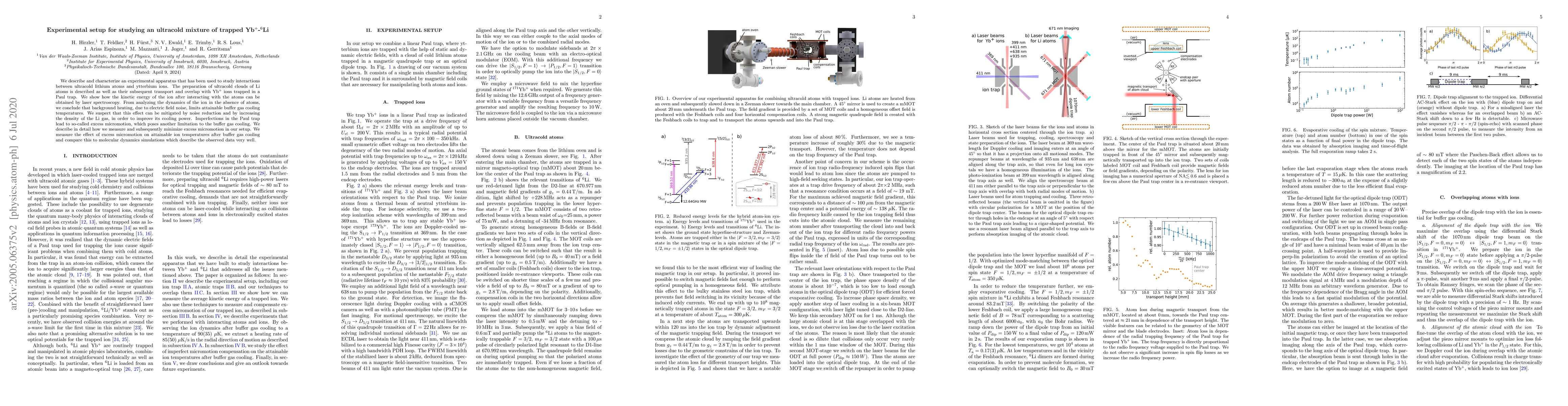 The paper details an experimental setup for studying ultracold Yb+ ions interacting with Li atoms. Key findings include identifying background heating from electric field noise as a limit to buffer gas cooling and describing methods to minimize excess micromotion in the Paul trap, which also affects cooling. The study uses laser spectroscopy to measure ion kinetic energy post-interaction and compares results with molecular dynamics simulations.