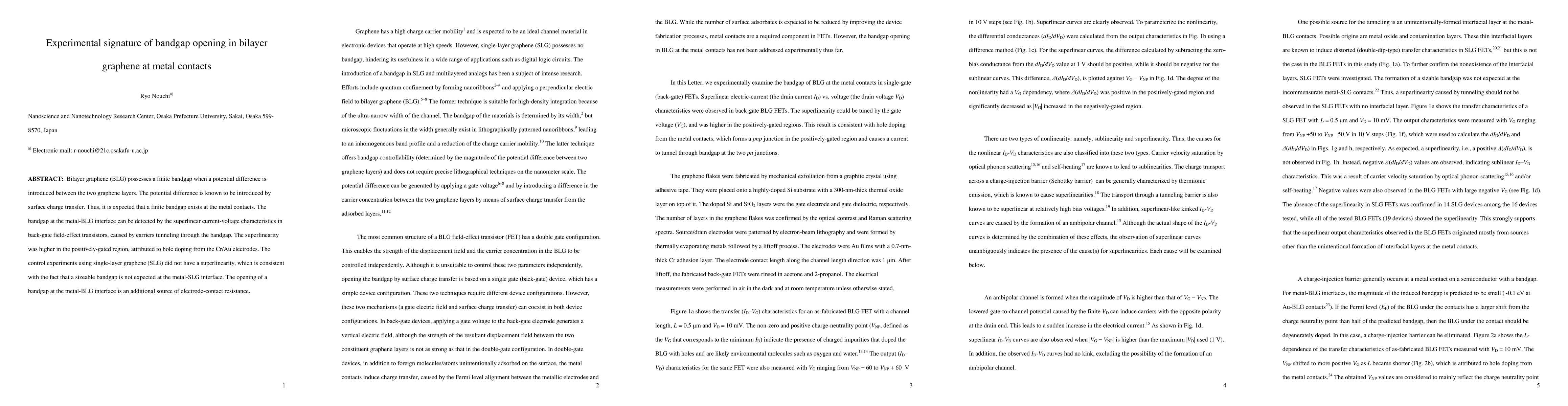 This study experimentally demonstrates the opening of a bandgap in bilayer graphene at metal contacts, evidenced by superlinear current-voltage characteristics in back-gate field-effect transistors. The superlinearity is attributed to hole doping from Cr/Au electrodes, confirming the presence of a bandgap at the metal-bilayer graphene interface, unlike in single-layer graphene.