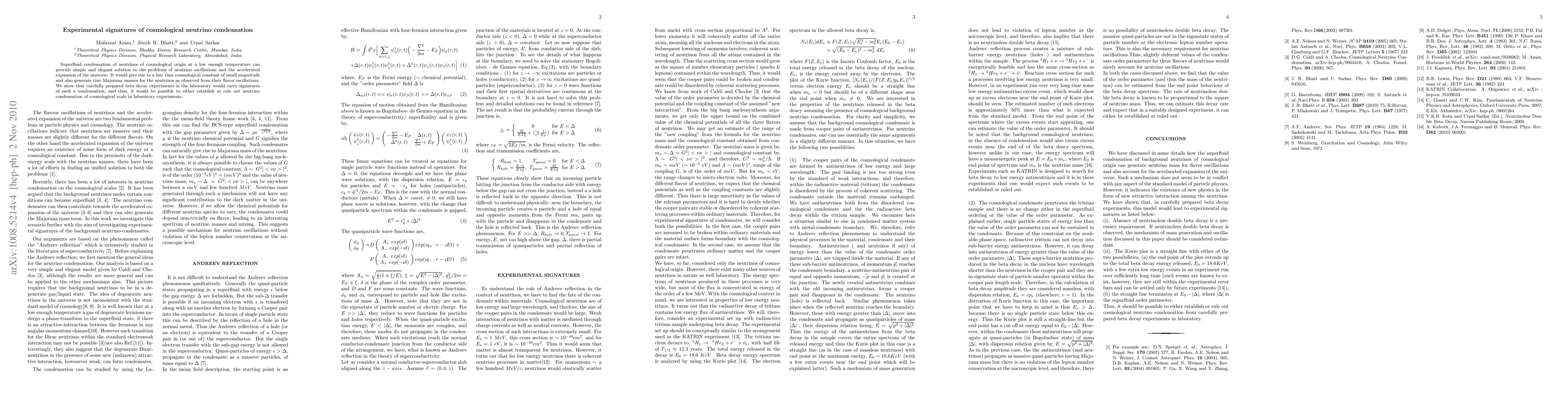 Superfluid condensation of neutrinos of cosmological origin at a low enough temperature can provide simple and elegant solution to the problems of neutrino oscillations and the accelerated expansion of the universe. It would give rise to a late time cosmological constant of small magnitude and also generate tiny Majorana masses for the neutrinos as observed from their flavor oscillations. We show that carefully prepared beta decay experiments in the laboratory would carry signatures of such a condensation, and thus, it would be possible to either establish or rule out neutrino condensation of cosmological scale in laboratory experiments.