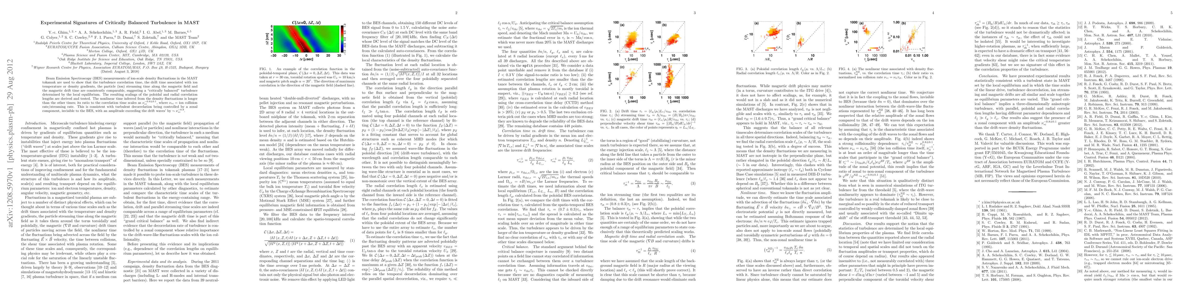 This paper uses Beam Emission Spectroscopy to analyze ion-scale density fluctuations in MAST tokamak, revealing a "critically balanced" turbulence where various drift and streaming times are comparable. The study derives and tests scalings of turbulence correlation lengths, finding that the nonlinear time is longer and scales with the ion collision rate, suggesting a dominant zonal component in the turbulence.