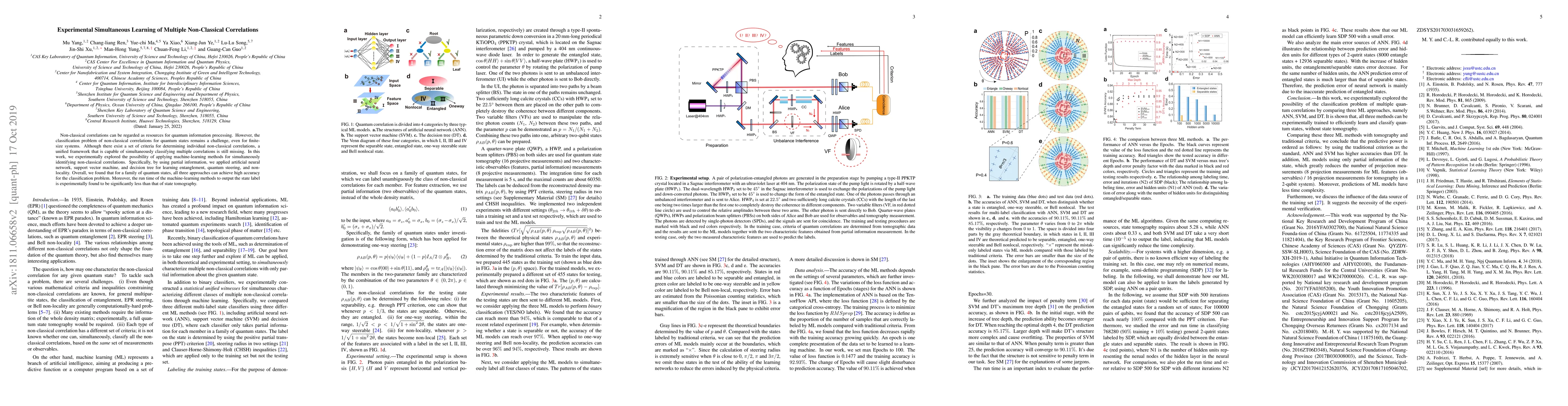 The paper presents an experimental implementation of machine learning techniques (ANN, SVM, DT) for simultaneously identifying various non-classical correlations in quantum states, showcasing their efficiency and accuracy compared to traditional criteria and state tomography.