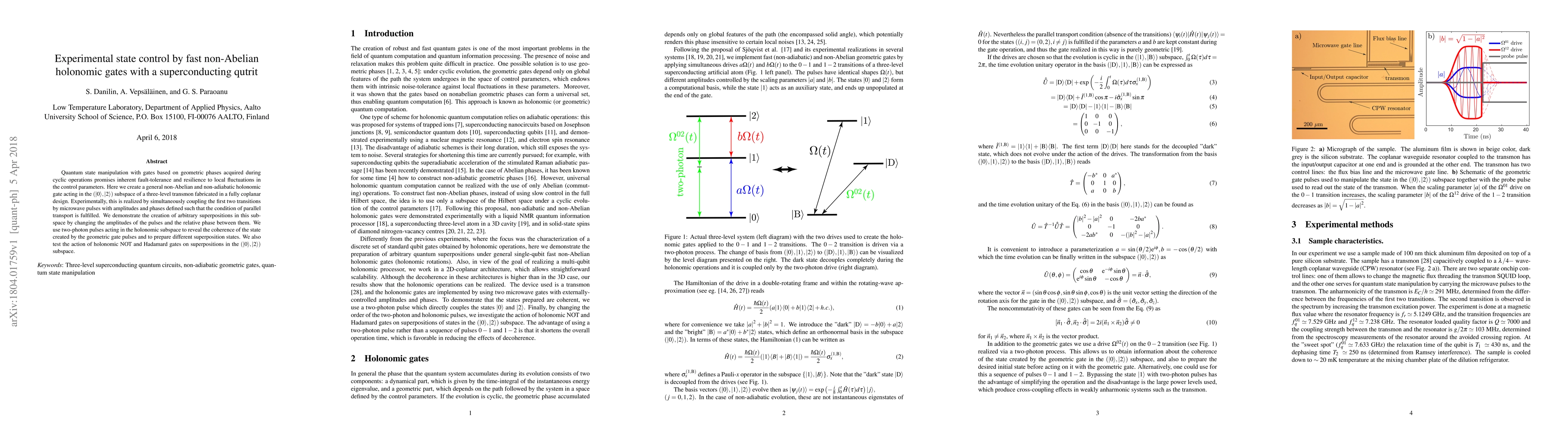 Quantum state manipulation with gates based on geometric phases acquired during cyclic operations promises inherent fault-tolerance and resilience to local fluctuations in the control parameters. Here we create a general non-Abelian and non-adiabatic holonomic gate acting in the $(\ket{0},\ket{2})$ subspace of a three-level transmon fabricated in a fully coplanar design. Experimentally, this is realized by simultaneously coupling the first two transitions by microwave pulses with amplitudes and phases defined such that the condition of parallel transport is fulfilled. We demonstrate the creation of arbitrary superpositions in this subspace by changing the amplitudes of the pulses and the relative phase between them. We use two-photon pulses acting in the holonomic subspace to reveal the coherence of the state created by the geometric gate pulses and to prepare different superposition states. We also test the action of holonomic NOT and Hadamard gates on superpositions in the $(\ket{0},\ket{2})$ subspace.