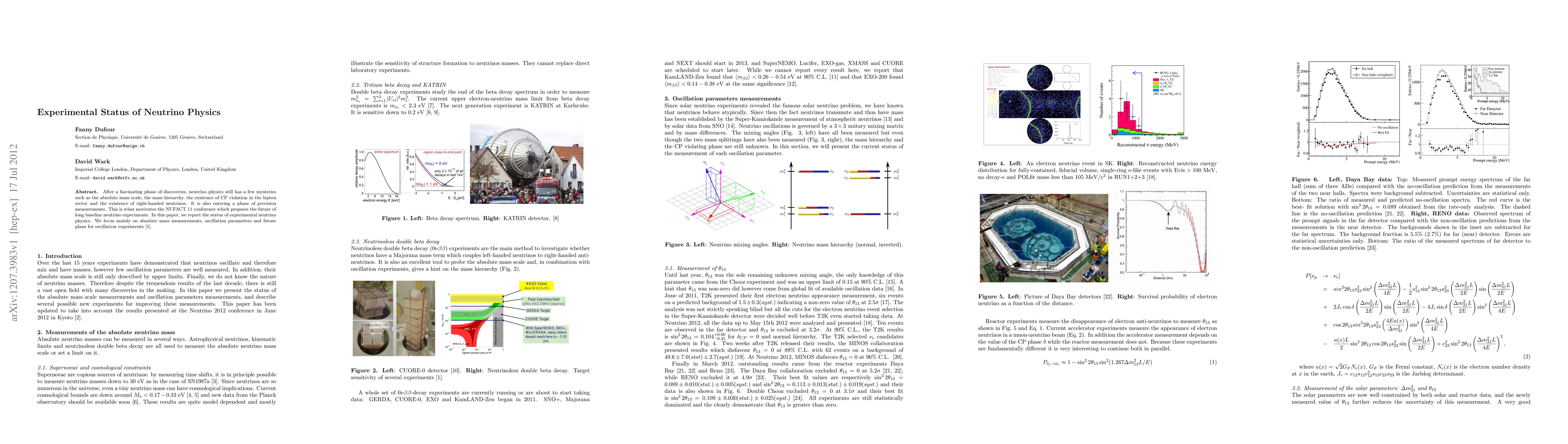 After a fascinating phase of discoveries, neutrino physics still has a few mysteries such as the absolute mass scale, the mass hierarchy, the existence of CP violation in the lepton sector and the existence of right-handed neutrinos. It is also entering a phase of precision measurements. This is what motivates the NUFACT 11 conference which prepares the future of long baseline neutrino experiments. In this paper, we report the status of experimental neutrino physics. We focus mainly on absolute mass measurements, oscillation parameters and future plans for oscillation experiments.