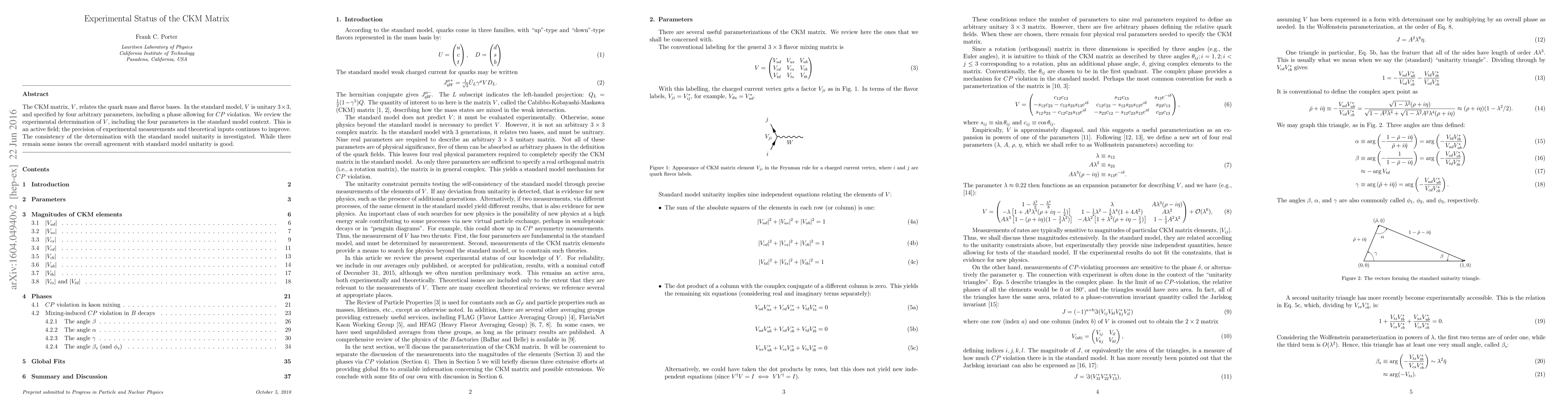 Researchers review experimental determination of the CKM matrix V in the standard model, finding overall agreement with unitarity despite some issues.