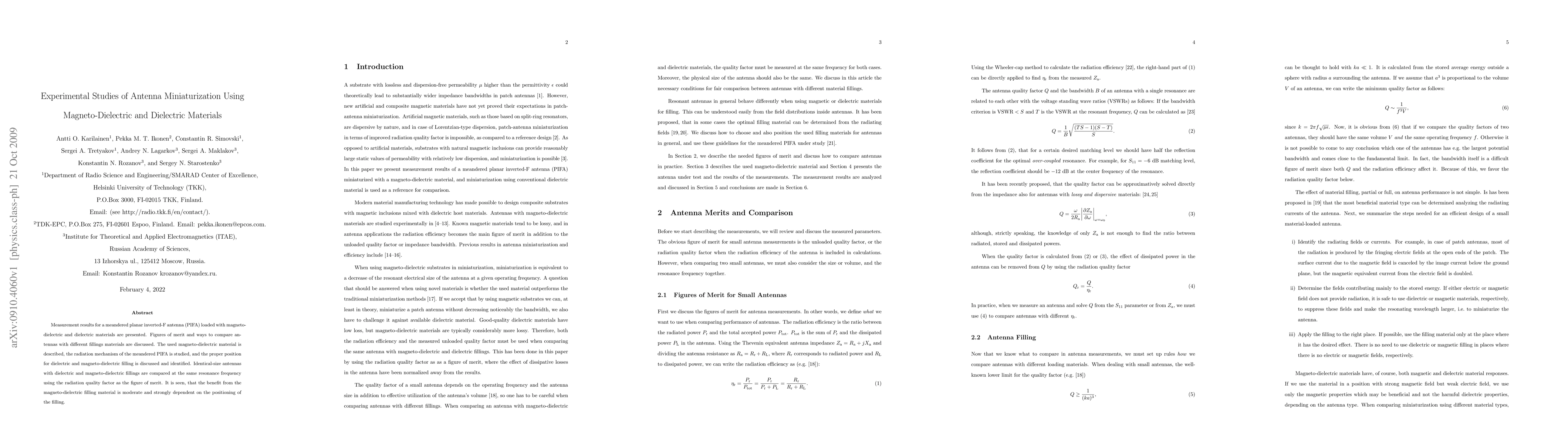 This paper presents experimental results on miniaturizing a meandered planar inverted-F antenna (PIFA) using magneto-dielectric and dielectric materials. The study finds that while magneto-dielectric filling offers moderate benefits, its effectiveness is highly contingent on the material's placement within the antenna structure.