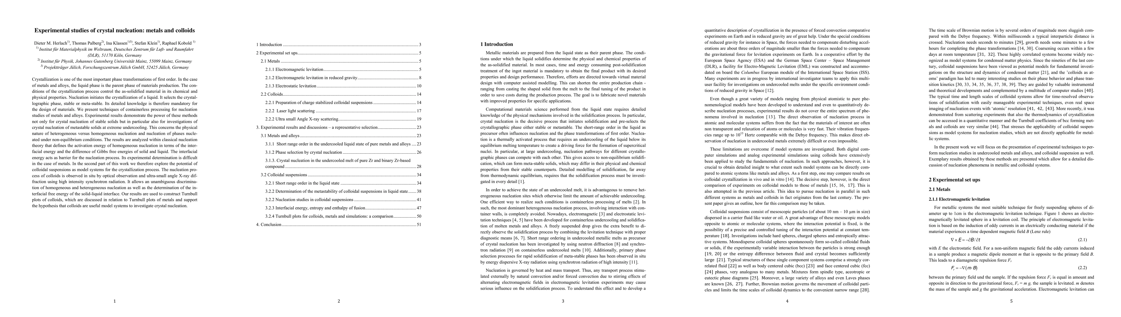 This paper explores techniques for studying crystal nucleation in metals and alloys, focusing on containerless processing methods to investigate nucleation under extreme conditions. It also uses colloidal suspensions as model systems to better understand nucleation processes, employing optical and X-ray diffraction techniques to distinguish between homogeneous and heterogeneous nucleation, and to determine interfacial energies.