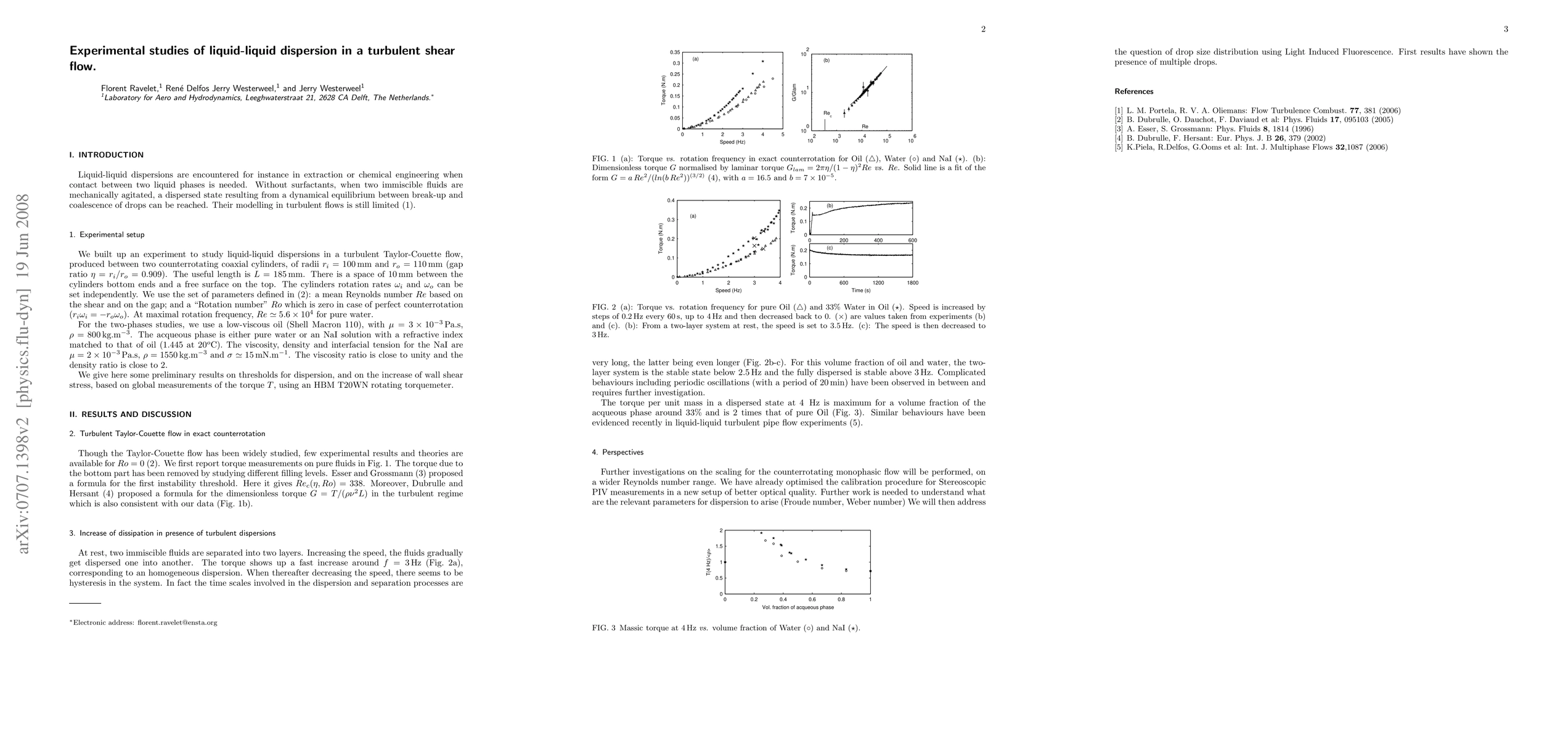 This study investigates liquid-liquid dispersions in turbulent Taylor-Couette flow, reaching Reynolds numbers up to 1.4 x 10^5. It characterizes single-phase flow and finds the torque per unit mass in two-phase flows can be double that of single-phase flows, with detailed analysis of dissipation and long-time behaviors.