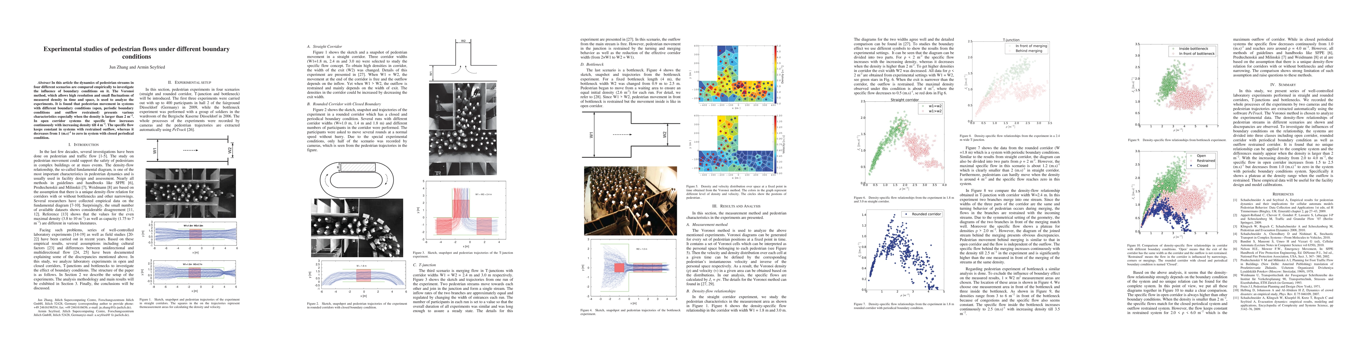 This paper empirically investigates pedestrian flow dynamics under four boundary conditions using the Voronoi method. Results show that different boundary conditions significantly affect pedestrian movement, especially at densities exceeding 2 m-2, with specific flow increasing in open corridors up to 4 m-2, while remaining constant in restrained outflow systems and decreasing in closed periodic conditions.