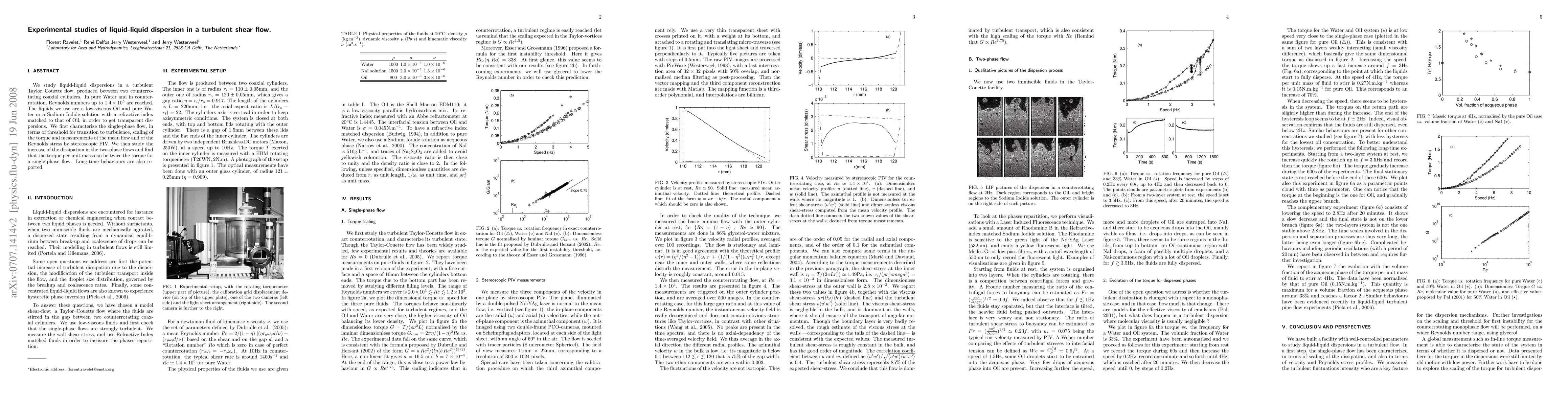 We study liquid-liquid dispersions in a turbulent Taylor-Couette flow, produced between two counterrotating coaxial cylinders. In pure Water and in counterrotation, Reynolds numbers up to 1.4 10^5 are reached. The liquids we use are a low-viscous Oil and pure Water or a Sodium Iodide solution with a refractive index matched to that of Oil, in order to get transparent dispersions. We first characterize the single-phase flow, in terms of threshold for transition to turbulence, scaling of the torque and measurements of the mean flow and of the Reynolds stress by stereoscopic PIV. We then study the increase of the dissipation in the two-phase flows and find that the torque per unit mass can be twice the torque for a single-phase flow. Long-time behaviours are also reported.