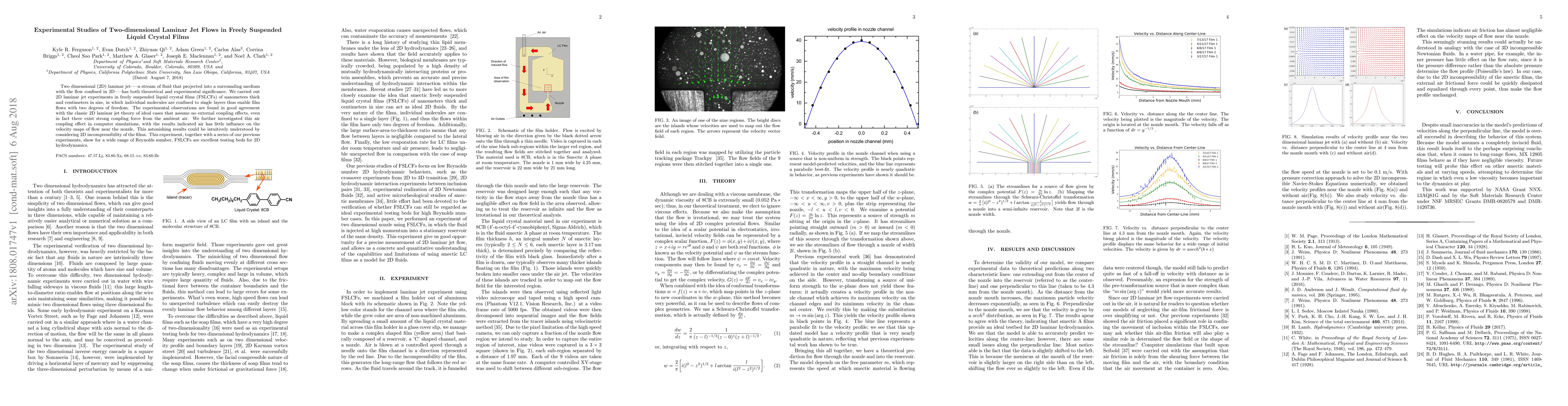 This study experimentally investigates two-dimensional laminar jet flows in freely suspended liquid crystal films, finding agreement with classic theory despite ambient air coupling. Computer simulations confirm minimal air influence on flow near the nozzle, highlighting the films' utility for 2D hydrodynamic studies.