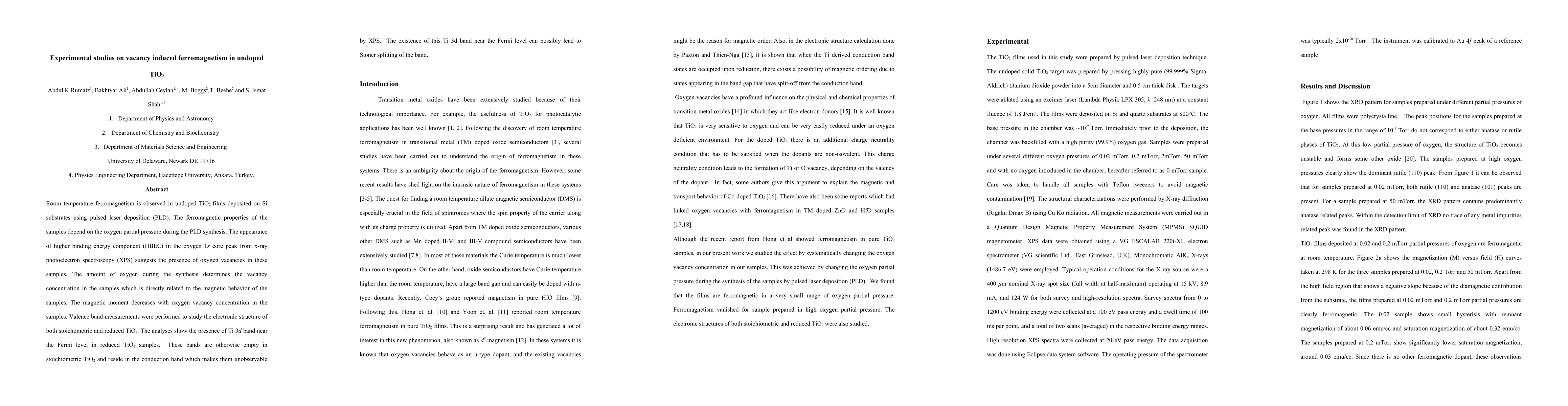 Room temperature ferromagnetism is observed in undoped TiO2 films deposited on Si substrates using pulsed laser deposition (PLD). The ferromagnetic properties of the samples depend on the oxygen partial pressure during the PLD synthesis. The appearance of higher binding energy component (HBEC) in the oxygen 1s core peak from x-ray photoelectron spectroscopy (XPS) suggests the presence of oxygen vacancies in these samples. The amount of oxygen during the synthesis determines the vacancy concentration in the samples which is directly related to the magnetic behavior of the samples. The magnetic moment decreases with oxygen vacancy concentration in the samples. Valence band measurements were performed to study the electronic structure of both stoichometric and reduced TiO2. The analyses show the presence of Ti 3d band near the Fermi level in reduced TiO2 samples. These bands are otherwise empty in stoichiometric TiO2 and reside in the conduction band which makes them unobservable by XPS. The existence of this Ti 3d band near the Fermi level can possibly lead to Stoner splitting of the band.