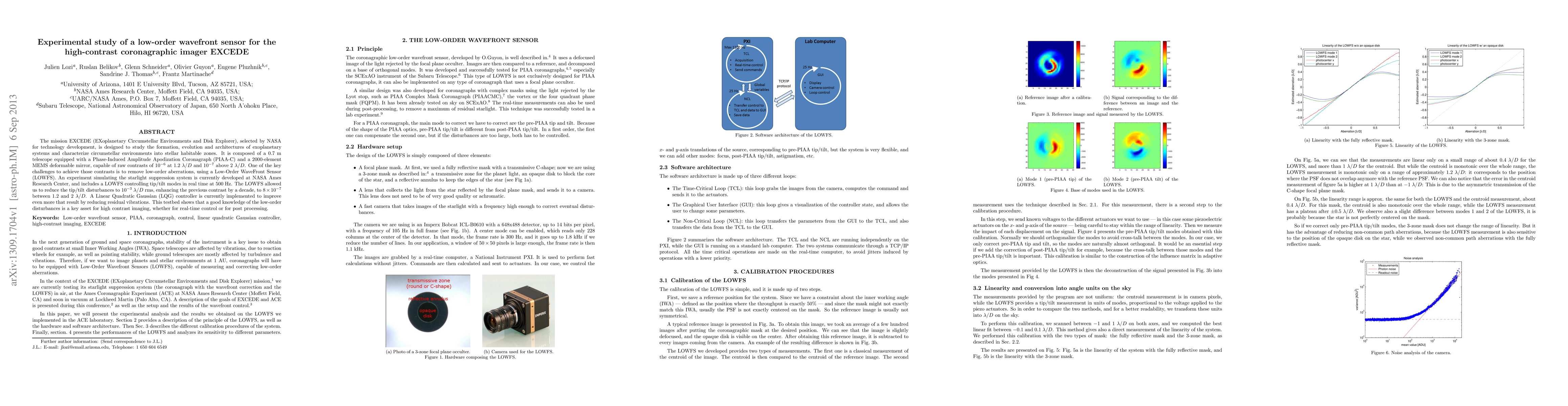 The mission EXCEDE (EXoplanetary Circumstellar Environments and Disk Explorer), selected by NASA for technology development, is designed to study the formation, evolution and architectures of exoplanetary systems and characterize circumstellar environments into stellar habitable zones. It is composed of a 0.7 m telescope equipped with a Phase-Induced Amplitude Apodization Coronagraph (PIAA-C) and a 2000-element MEMS deformable mirror, capable of raw contrasts of 1e-6 at 1.2 lambda/D and 1e-7 above 2 lambda/D. One of the key challenges to achieve those contrasts is to remove low-order aberrations, using a Low-Order WaveFront Sensor (LOWFS). An experiment simulating the starlight suppression system is currently developed at NASA Ames Research Center, and includes a LOWFS controlling tip/tilt modes in real time at 500 Hz. The LOWFS allowed us to reduce the tip/tilt disturbances to 1e-3 lambda/D rms, enhancing the previous contrast by a decade, to 8e-7 between 1.2 and 2 lambda/D. A Linear Quadratic Gaussian (LQG) controller is currently implemented to improve even more that result by reducing residual vibrations. This testbed shows that a good knowledge of the low-order disturbances is a key asset for high contrast imaging, whether for real-time control or for post processing.