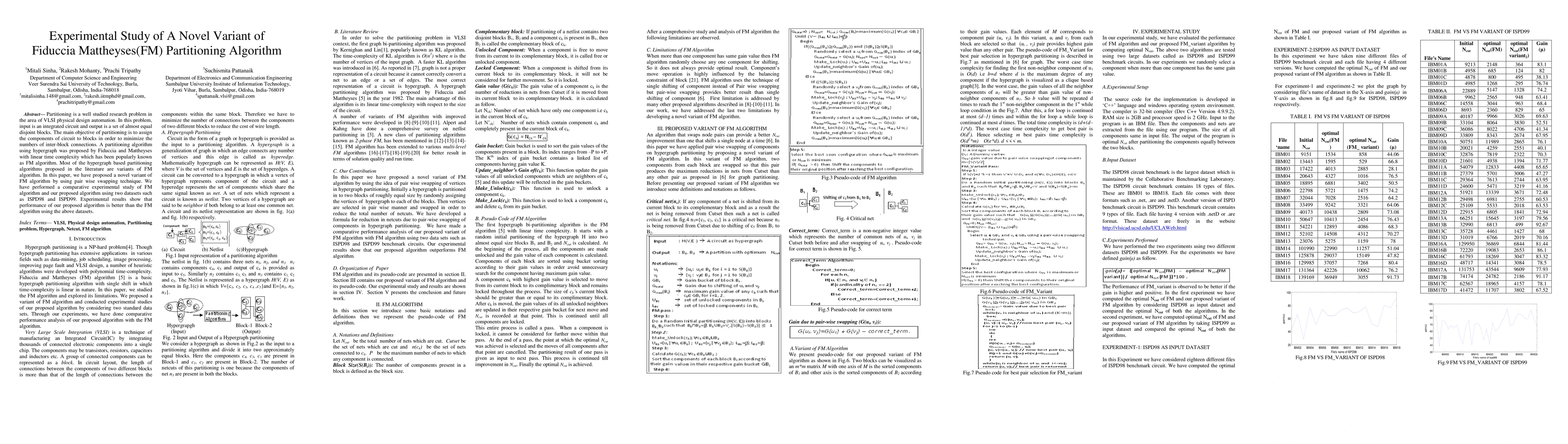 Partitioning is a well studied research problem in the area of VLSI physical design automation. In this problem, input is an integrated circuit and output is a set of almost equal disjoint blocks. The main objective of partitioning is to assign the components of circuit to blocks in order to minimize the numbers of inter-block connections. A partitioning algorithm using hypergraph was proposed by Fiduccia and Mattheyses with linear time complexity which has been popularly known as FM algorithm. Most of the hypergraph based partitioning algorithms proposed in the literature are variants of FM algorithm. In this paper, we have proposed a novel variant of FM algorithm by using pair wise swapping technique. We have performed a comparative experimental study of FM algorithm and our proposed algorithm using two dataset such as ISPD98 and ISPD99. Experimental results show that performance of our proposed algorithm is better than the FM algorithm using the above dataset.