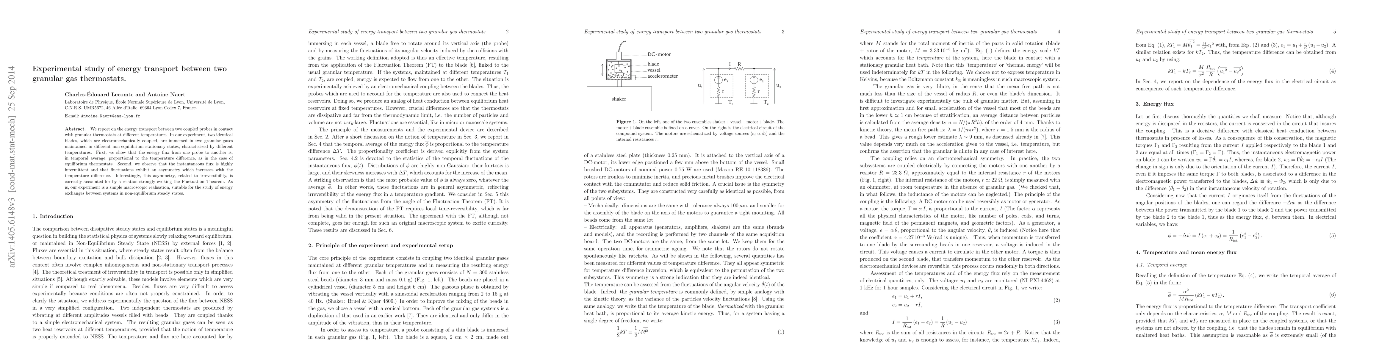 We report on the energy transport between two coupled probes in contact with granular thermostats at different temperatures. In our experiment, two identical blades, which are electromechanically coupled, are immersed in two granular gases maintained in different non-equilibrium stationary states, characterized by different temperatures. First, we show that the energy flux from one probe to another is, in temporal average, proportional to the temperature difference, as in the case of equilibrium thermostats. Second, we observe that the instantaneous flux is highly intermittent and that fluctuations exhibit an asymmetry which increases with the temperature difference. Interestingly, this asymmetry, related to irreversibility, is correctly accounted for by a relation strongly evoking the Fluctuation Theorem. As is, our experiment is a simple macroscopic realisation, suitable for the study of energy exchanges between systems in non-equilibrium steady states.