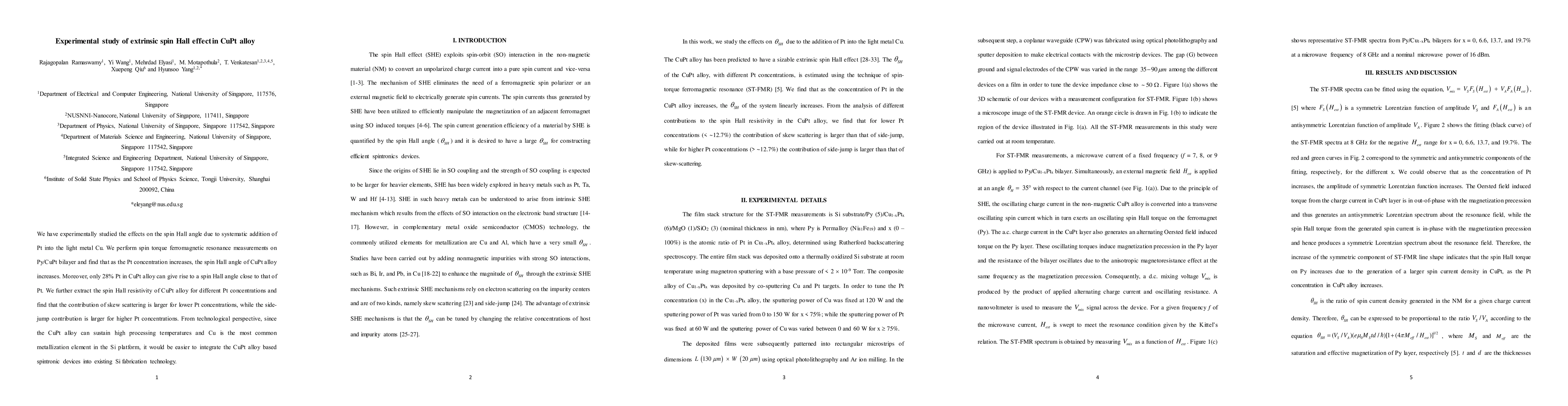 We have experimentally studied the effects on the spin Hall angle due to systematic addition of Pt into the light metal Cu. We perform spin torque ferromagnetic resonance measurements on Py/CuPt bilayer and find that as the Pt concentration increases, the spin Hall angle of CuPt alloy increases. Moreover, only 28% Pt in CuPt alloy can give rise to a spin Hall angle close to that of Pt. We further extract the spin Hall resistivity of CuPt alloy for different Pt concentrations and find that the contribution of skew scattering is larger for lower Pt concentrations, while the side-jump contribution is larger for higher Pt concentrations. From technological perspective, since the CuPt alloy can sustain high processing temperatures and Cu is the most common metallization element in the Si platform, it would be easier to integrate the CuPt alloy based spintronic devices into existing Si fabrication technology.