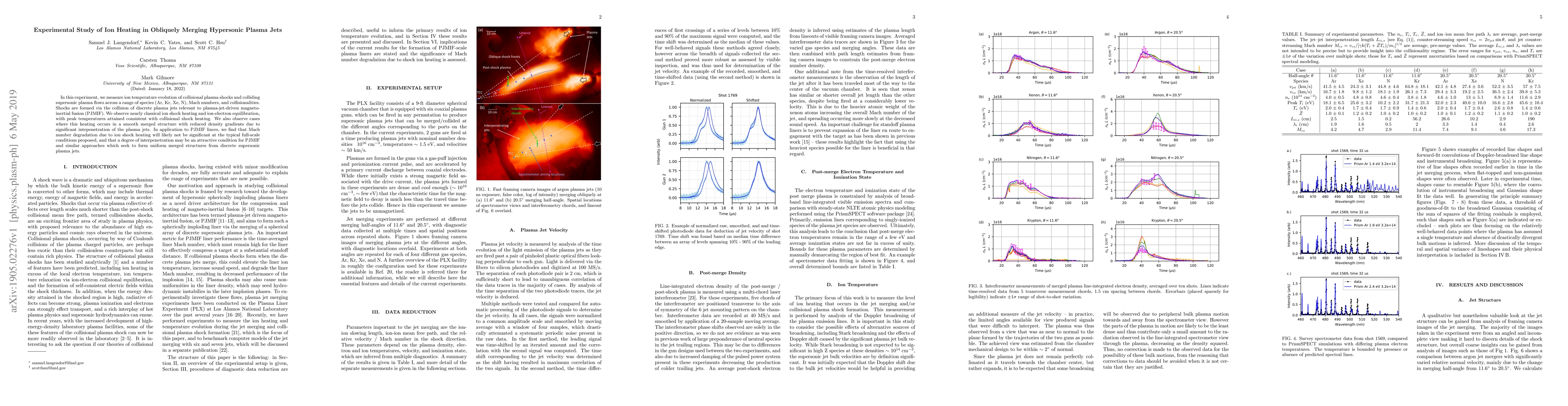 This study investigates ion heating in obliquely merging hypersonic plasma jets, observing classical shock heating and ion-electron equilibration. It finds that significant interpenetration of plasma jets can create smooth merged structures with reduced density gradients, potentially beneficial for plasma-jet-driven magneto-inertial fusion (PJMIF) liners.