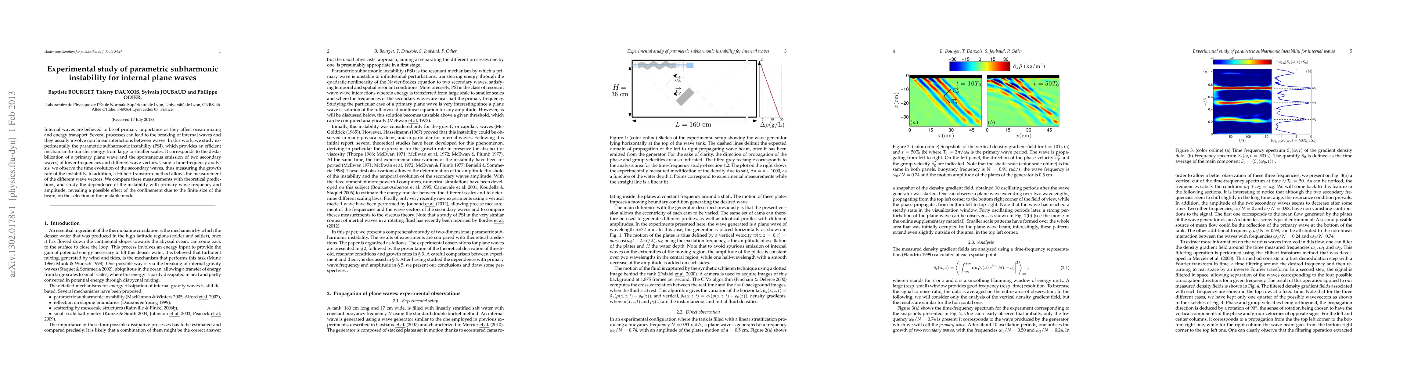 This study experimentally investigates parametric subharmonic instability (PSI) in internal waves, observing the destabilization of primary waves leading to the emission of secondary waves. The research employs time-frequency analysis and Hilbert transform to measure the growth rate and wave vectors, comparing results with theoretical predictions and exploring the influence of wave frequency, amplitude, and confinement effects.