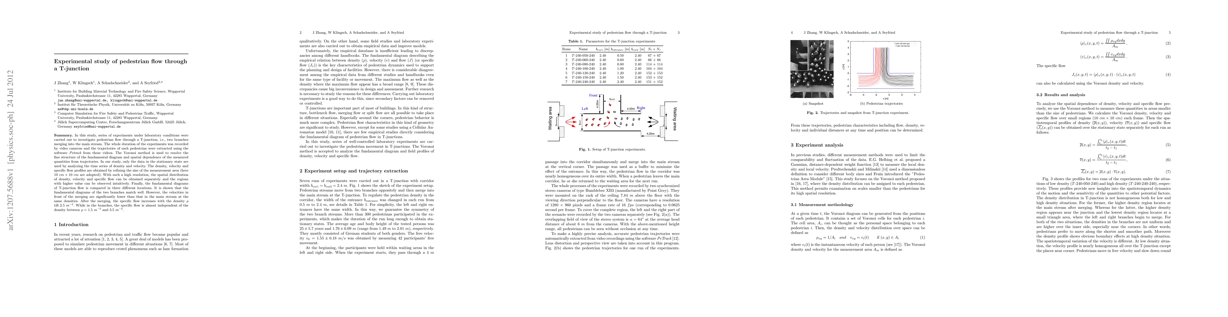 This study experimentally investigates pedestrian flow through a T-junction using high-resolution video analysis and the Voronoi method. Results show that merging branches have lower velocities than the main stream at similar densities, and specific flow increases with density post-merging.