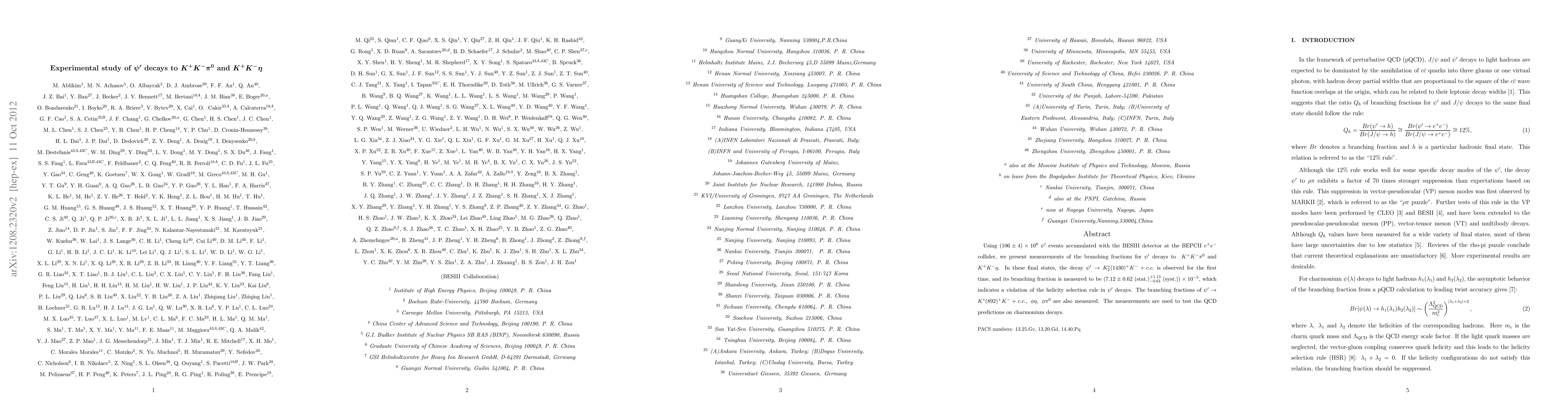 This study using the BESIII detector measures branching fractions for $\psip$ decays to $K^{+}K^{-}\pi^{0}$ and $K^{+}K^{-}\eta$, observing the decay $\psi'\to K_2^{*}(1430)^+K^-+c.c.$ for the first time and indicating a violation of the helicity selection rule. The results also provide insights into QCD predictions for charmonium decays.