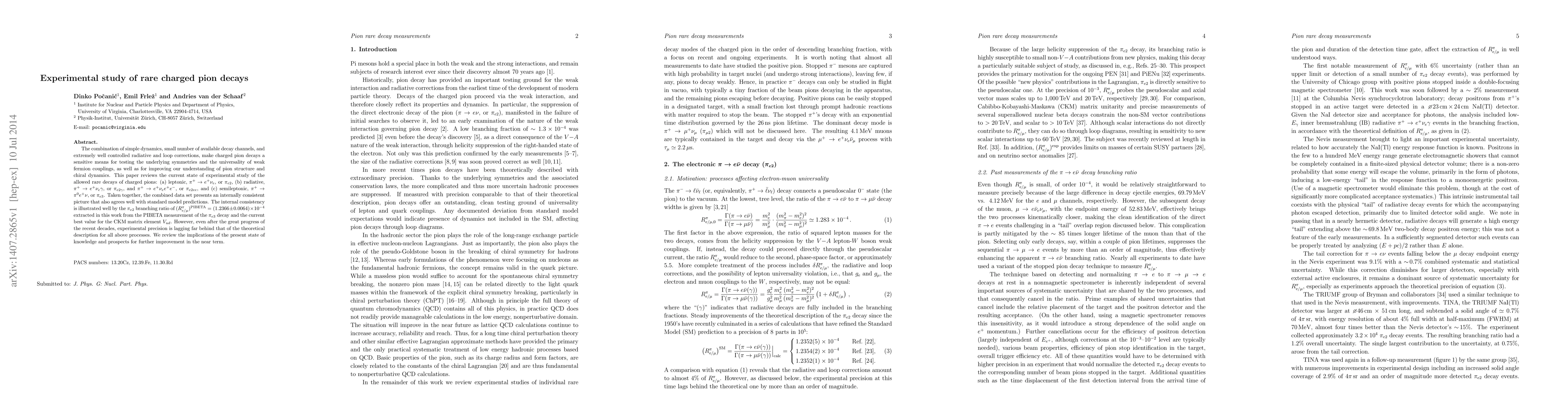 The combination of simple dynamics, small number of available decay channels, and extremely well controlled radiative and loop corrections, make charged pion decays a sensitive means for testing the underlying symmetries and the universality of weak fermion couplings, as well as for improving our understanding of pion structure and chiral dynamics. This paper reviews the current state of experimental study of the allowed rare decays of charged pions: (a) leptonic, $\pi^+ \to e^+\nu_e$, or $\pi_{e2}$, (b) radiative, $\pi^+ \to e^+\nu_e\gamma$, or $\pi_{e2\gamma}$, and $\pi^+ \to e^+\nu_e e^+e^-$, or $\pi_{e2ee}$, and (c) semileptonic, $\pi^+\to \pi^0 e^+ \nu$, or $\pi_{e3}$. Taken together, the combined data set presents an internally consistent picture that also agrees well with standard model predictions. The internal consistency is illustrated well by the $\pi_{e2}$ branching ratio of $(R_{e/\mu}^\pi)^{\rm PIBETA} = (1.2366 \pm 0.0064) \times 10^{-4}$ extracted in this work from the PIBETA measurement of the $\pi_{e3}$ decay and the current best value for the CKM matrix element $V_{ud}$. However, even after the great progress of the recent decades, experimental precision is lagging far behind that of the theoretical description for all above processes. We review the implications of the present state of knowledge and prospects for further improvement in the near term.