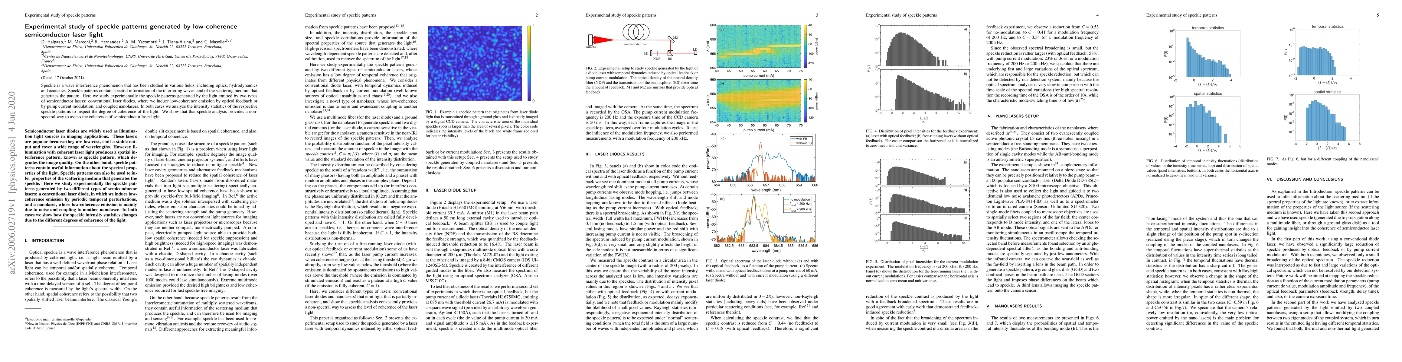 This study experimentally investigates the speckle patterns produced by low-coherence semiconductor laser light, focusing on conventional laser diodes and coupled nanolasers. The analysis of intensity statistics reveals a non-spectral method to evaluate the coherence of the emitted light.