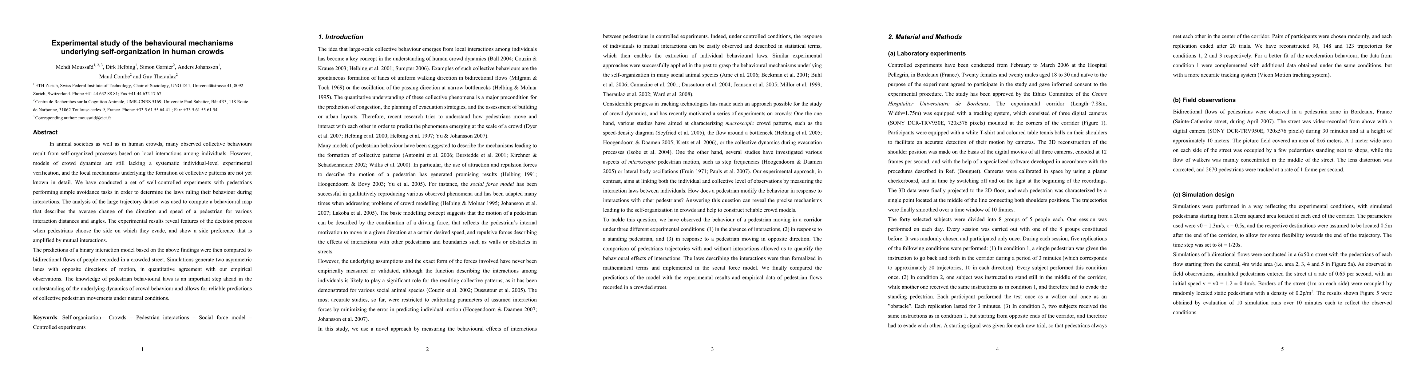 This study experimentally investigates the behavioural mechanisms behind self-organization in human crowds through controlled pedestrian avoidance tasks, revealing a side preference amplified by mutual interactions. The findings support a binary interaction model that accurately predicts bidirectional pedestrian flows in crowded streets, advancing the understanding of crowd dynamics.