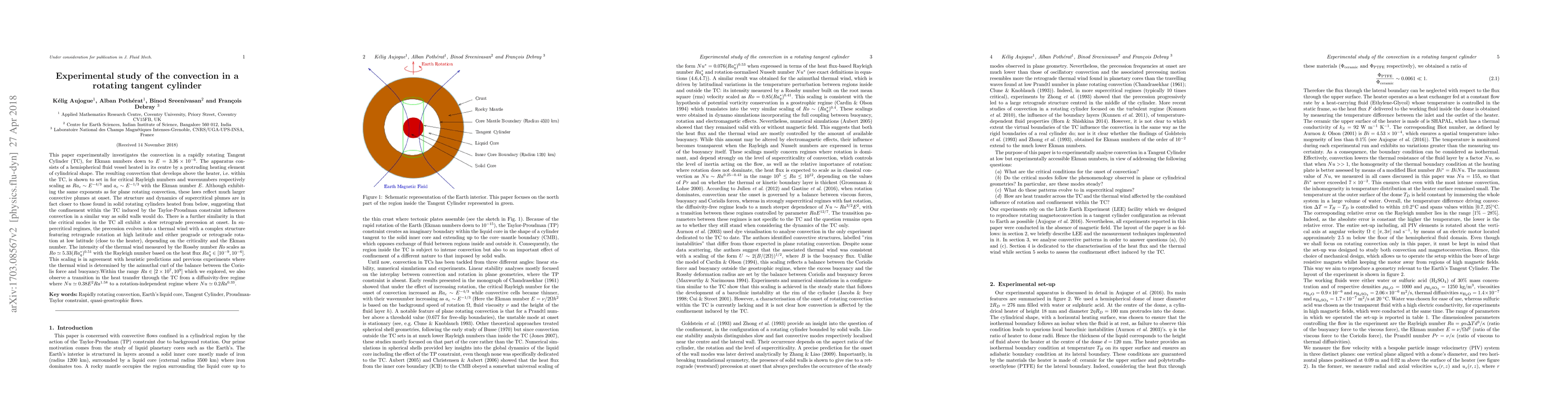 This study experimentally examines convection in a fast-rotating Tangent Cylinder, revealing critical onset conditions scaling as $Ra_c\sim E^{4/3}$ and $a_c\sim E^{1/3}$, with larger convective plumes compared to plane rotating convection. The convection dynamics are driven by quasi-geostrophic processes, as indicated by the scaling $Ro\sim 0.85(Ra_q^*)^{0.41}$ and $Nu^{*} \sim (Ra_{q}^{*})^{5/9}$.