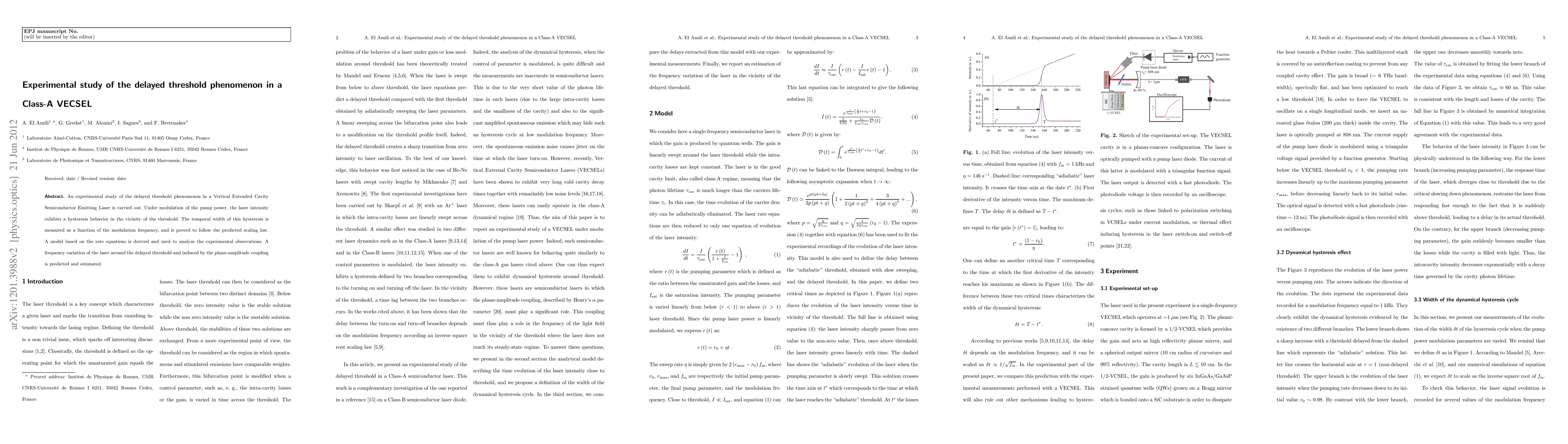 An experimental study of the delayed threshold phenomenon in a Vertical Extended Cavity Semiconductor Emitting Laser is carried out. Under modulation of the pump power, the laser intensity exhibits a hysteresis behavior in the vicinity of the threshold. The temporal width of this hysteresis is measured as a function of the modulation frequency, and is proved to follow the predicted scaling law. A model based on the rate equations is derived and used to analyze the experimental observations. A frequency variation of the laser around the delayed threshold and induced by the phase-amplitude coupling is predicted and estimated.