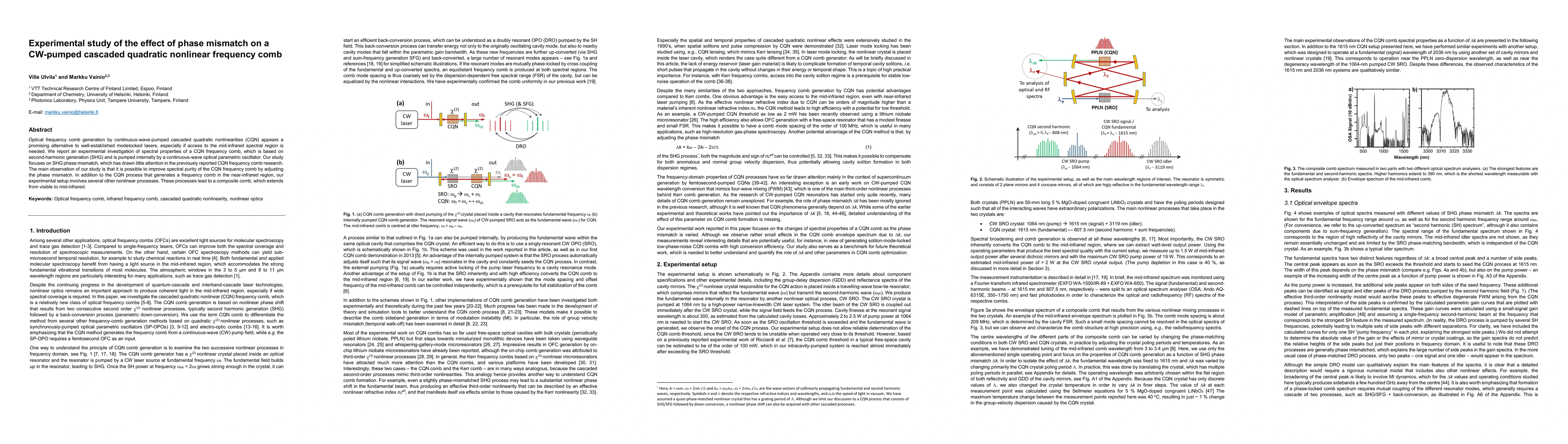 Optical frequency comb generation by continuous-wave-pumped cascaded quadratic nonlinearities (CQN) appears a promising alternative to well-established modelocked lasers, especially if access to the mid-infrared spectral region is needed. We report an experimental investigation of spectral properties of a CQN frequency comb, which is based on second-harmonic generation (SHG) and is pumped internally by a continuous-wave optical parametric oscillator. Our study focuses on SHG phase mismatch, which has drawn little attention in the previously reported CQN frequency comb research. The main observation of our study is that it is possible to improve spectral purity of the CQN frequency comb by adjusting the phase mismatch. In addition to the CQN process that generates a frequency comb in the near-infrared region, our experimental setup involves several other nonlinear processes. These processes lead to a composite comb, which extends from visible to mid-infrared.