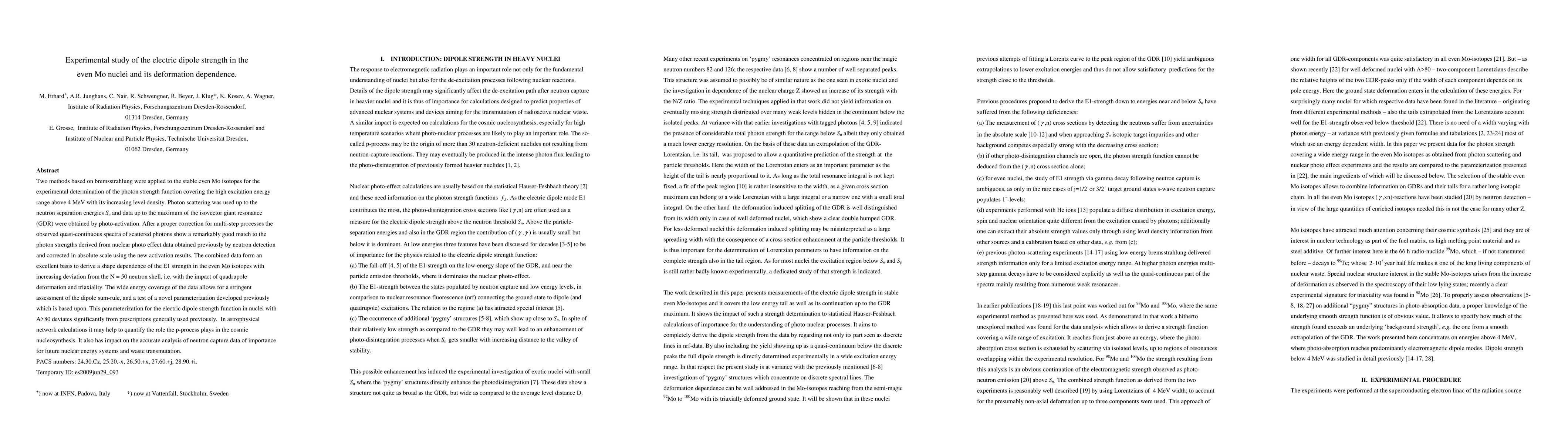 Two methods based on bremsstrahlung were applied to the stable even Mo isotopes for the experimental determination of the photon strength function covering the high excitation energy range above 4 MeV with its increasing level density. Photon scattering was used up to the neutron separation energies Sn and data up to the maximum of the isovector giant resonance(GDR) were obtained by photo-activation. After a proper correction for multi-step processes the observed quasi-continuous spectra of scattered photons show a remarkably good match to the photon strengths derived from nuclear photo effect data obtained previously by neutron detection and corrected in absolute scale using the new activation results. The combined data form an excellent basis to derive a shape dependence of the E1 strength in the even Mo isotopes with increasing deviation from the N = 50 neutron shell, i.e. with the impact of quadrupole deformation and triaxiality. The wide energy coverage of the data allows for a stringent assessment of the dipole sum-rule, and a test of a novel parameterization developed previously which is based upon. This parameterization for the electric dipole strength function in nuclei with A>80 deviates significantly from prescriptions generally used previously. In astrophysical network calculations it may help to quantify the role the p-process plays in the cosmic nucleosynthesis. It also has impact on the accurate analysis of neutron capture data of importance for future nuclear energy systems and waste transmutation.