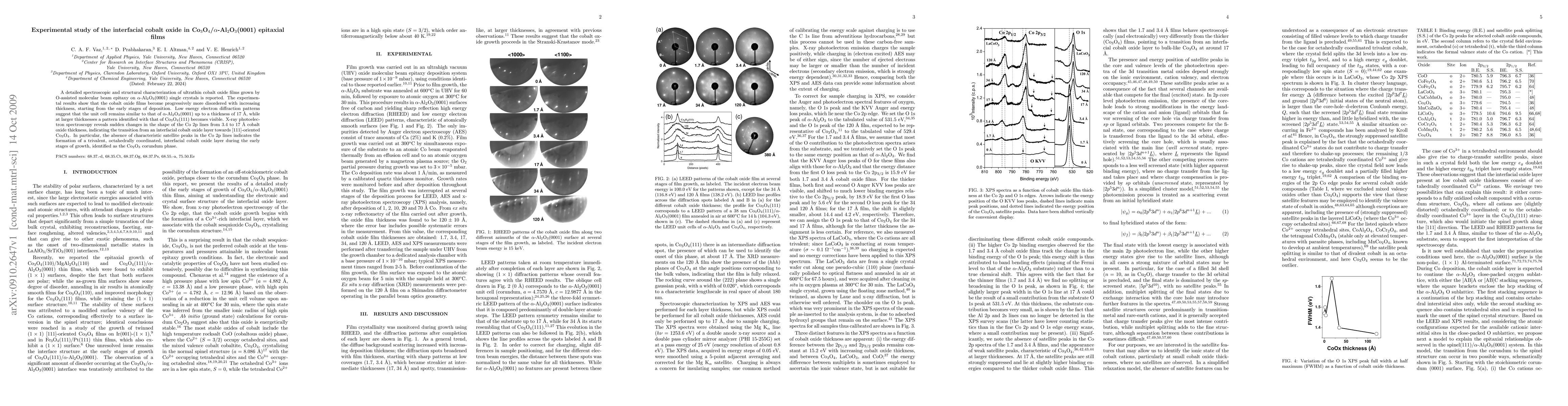 A detailed spectroscopic and structural characterization of ultrathin cobalt oxide films grown by O-assisted molecular beam epitaxy on a-Al2O3(0001) single crystals is reported. The experimental results show that the cobalt oxide films become progressively more disordered with increasing thickness, starting from the early stages of deposition. Low energy electron diffraction patterns suggest that the unit cell remains similar to that of a-Al2O3(0001) up to a thickness of 17 A, while at larger thicknesses a pattern identified with that of Co3O4(111) becomes visible. X-ray photoelectron spectroscopy reveals sudden changes in the shape of the Co 2p lines from 3.4 to 17 A cobalt oxide thickness, indicating the transition from an interfacial cobalt oxide layer towards [111]-oriented Co3O4. In particular, the absence of characteristic satellite peaks in the Co 2p lines indicates the formation of a trivalent, octahedrally coordinated, interfacial cobalt oxide layer during the early stages of growth, identified as the Co2O3 corundum phase.
