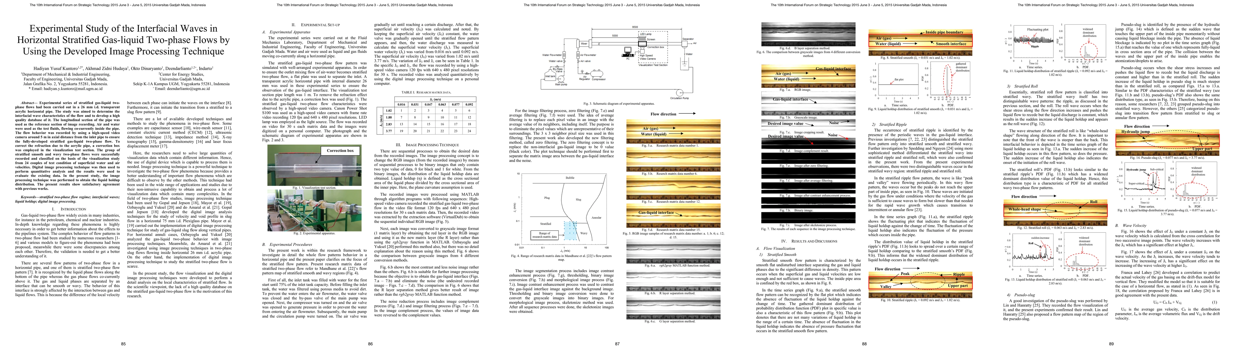 Experimental series of stratified gas-liquid two-phase flows had been carried out in a 26 mm i.d. transparent acrylic horizontal pipe. The study was aimed to determine the interfacial wave characteristics of the flow and to develop a high quality database of it. The longitudinal section of the pipe was used as the reference section of image recording. Air and water were used as the test fluids, flowing co-currently inside the pipe. The flow behavior was recorded by using a high-speed video camera around 5 m in axial distance from the inlet pipe to ensure the fully-developed stratified gas-liquid two-phase flow. To correct the refraction due to the acrylic pipe, a correction box was employed in the visualization test section. The group of stratified smooth and wavy two-phase flows were successfully recorded and classified on the basis of the visualization study from 24 couples of test condition of superficial water and air velocities. Digital image processing technique was then used to perform quantitative analysis and the results were used to evaluate the existing data. In the present study, the image processing technique was performed to obtain the liquid holdup distribution. The present results show satisfactory agreement with previous works.