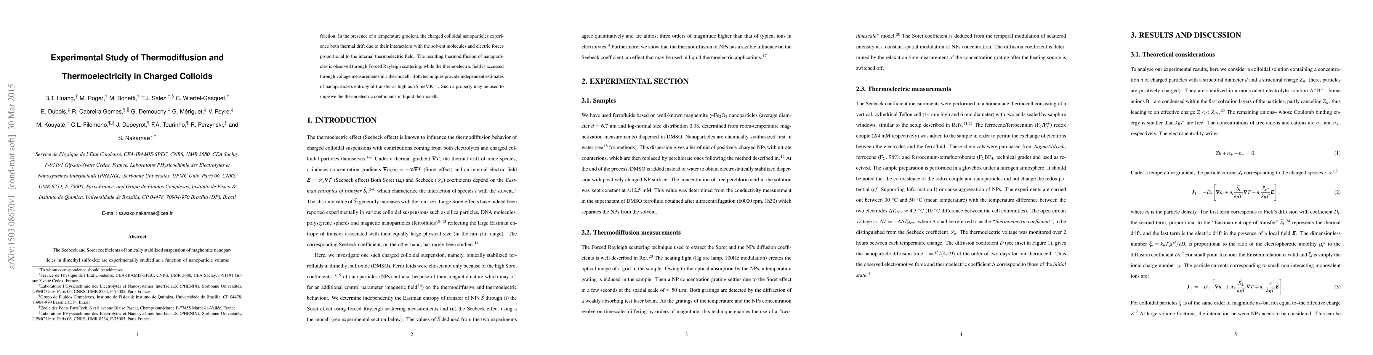 The Seebeck and Soret coefficients of ionically stabilized suspension of maghemite nanoparticles in dimethyl sulfoxide are experimentally studied as a function of nanoparticle volume fraction. In the presence of a temperature gradient, the charged colloidal nanoparticles experience both thermal drift due to their interactions with the solvent molecules and electric forces proportional to the internal thermoelectric field. The resulting thermodiffusion of nanoparticles is observed through Forced Rayleigh scattering, while the thermoelectric field is accessed through voltage measurements in a thermocell. Both techniques provide independent estimates of nanoparticle's entropy of transfer as high as 75 meV/K. Such a property may be used to improve the thermoelectric coefficients in liquid thermocells.