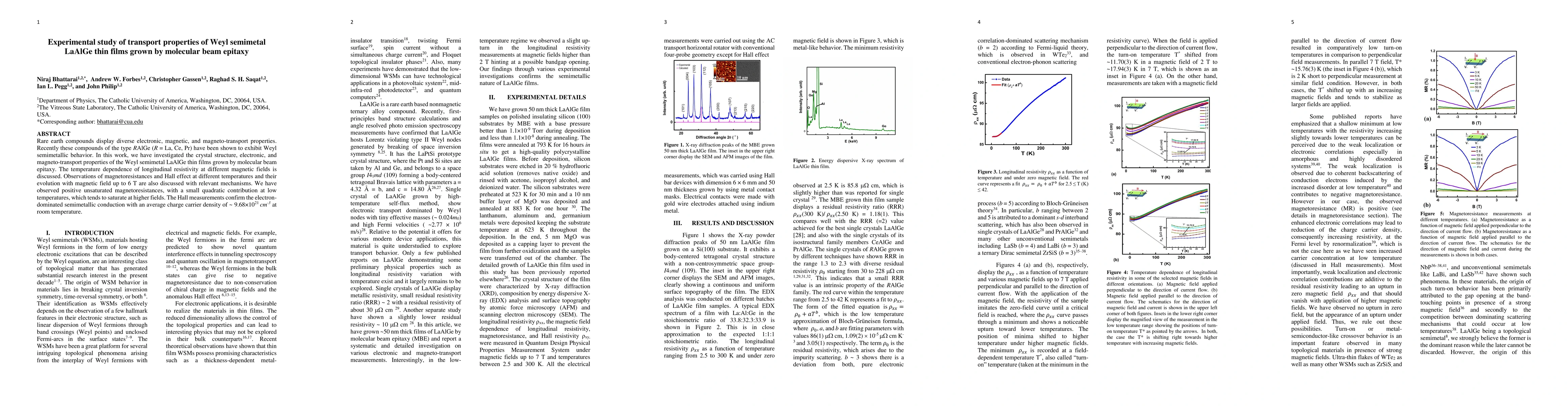 This study investigates the magneto-transport properties of Weyl semimetal LaAlGe thin films grown by molecular beam epitaxy, revealing positive unsaturated magnetoresistance and electron-dominated conduction with a charge carrier density of ~9.68×10^21 cm^(-3) at room temperature. The Hall effect confirms the semimetallic nature and the behavior evolves with magnetic fields.
