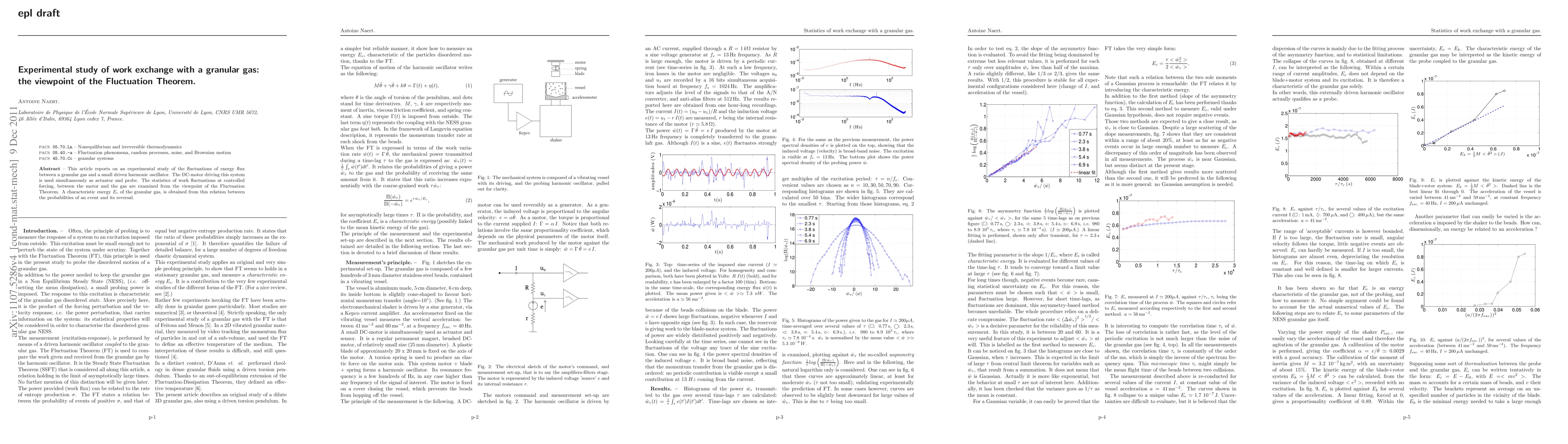 This article reports on an experimental study of the fluctuations of energy flux between a granular gas and a small driven harmonic oscillator. The DC-motor driving this system is used simultaneously as actuator and probe. The statistics of work fluctuations at controlled forcing, between the motor and the gas are examined from the viewpoint of the Fluctuation Theorem. A characteristic energy $E_c$ of the granular gas, is obtained from this relation between the probabilities of an event and its reversal.