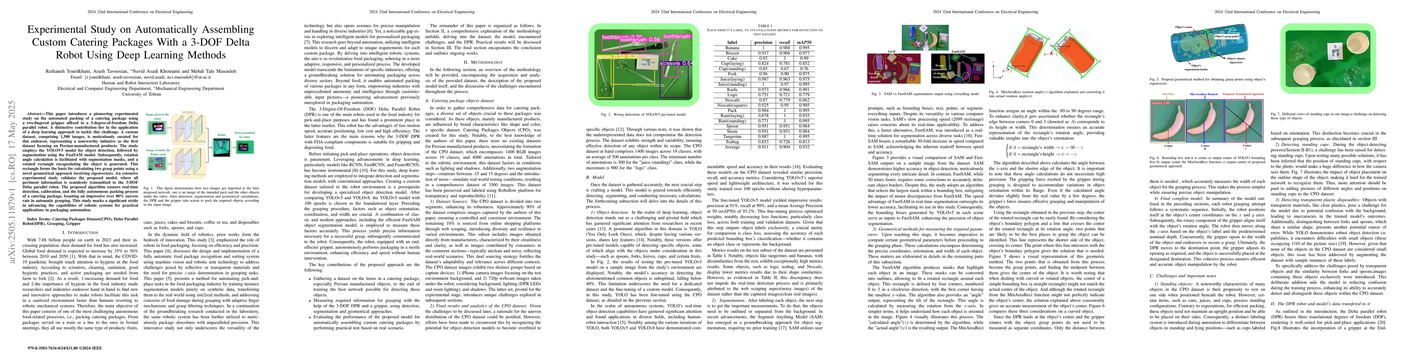 This paper introduces a pioneering experimental study on the automated packing of a catering package using a two-fingered gripper affixed to a 3-degree-of-freedom Delta parallel robot. A distinctive contribution lies in the application of a deep learning approach to tackle this challenge. A custom dataset, comprising 1,500 images, is meticulously curated for this endeavor, representing a noteworthy initiative as the first dataset focusing on Persian-manufactured products. The study employs the YOLOV5 model for object detection, followed by segmentation using the FastSAM model. Subsequently, rotation angle calculation is facilitated with segmentation masks, and a rotated rectangle encapsulating the object is generated. This rectangle forms the basis for calculating two grasp points using a novel geometrical approach involving eigenvectors. An extensive experimental study validates the proposed model, where all pertinent information is seamlessly transmitted to the 3-DOF Delta parallel robot. The proposed algorithm ensures real-time detection, calibration, and the fully autonomous packing process of a catering package, boasting an impressive over 80\% success rate in automatic grasping. This study marks a significant stride in advancing the capabilities of robotic systems for practical applications in packaging automation.