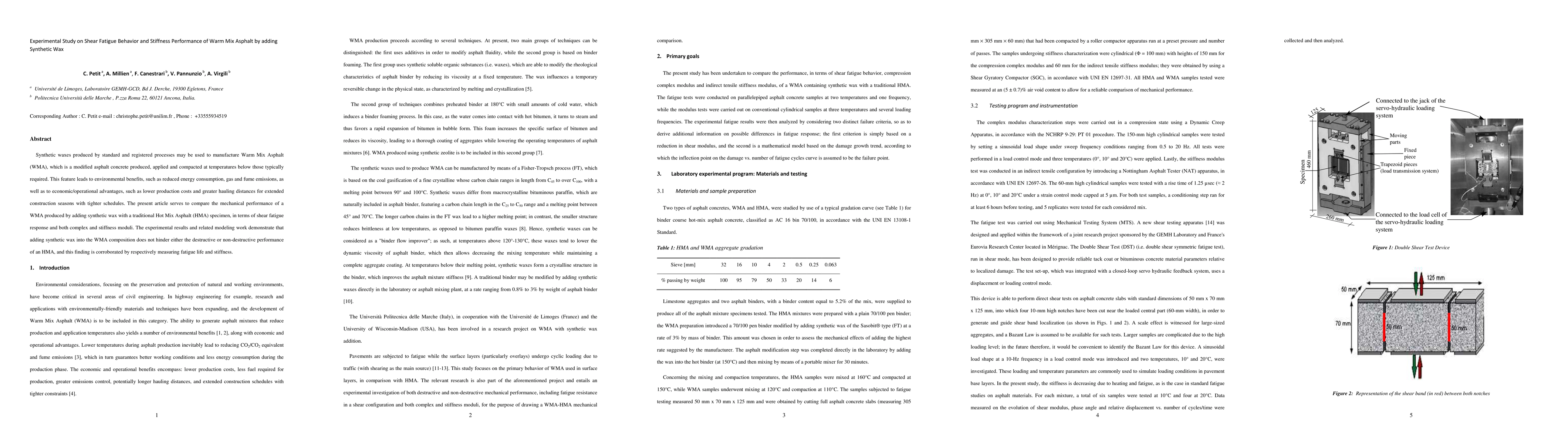 Synthetic waxes produced by standard and registered processes may be used to manufacture Warm Mix Asphalt (WMA), which is a modified asphalt concrete produced, applied and compacted at temperatures below those typically required. This feature leads to environmental benefits, such as reduced energy consumption, gas and fume emissions, as well as to economic/operational advantages, such as lower production costs and greater hauling distances for extended construction seasons with tighter schedules. The present article serves to compare the mechanical performance of a WMA produced by adding synthetic wax with a traditional Hot Mix Asphalt (HMA) specimen, in terms of shear fatigue response and both complex and stiffness moduli. The experimental results and related modeling work demonstrate that adding synthetic wax into the WMA composition does not hinder either the destructive or non-destructive performance of an HMA, and this finding is corroborated by respectively measuring fatigue life and stiffness.