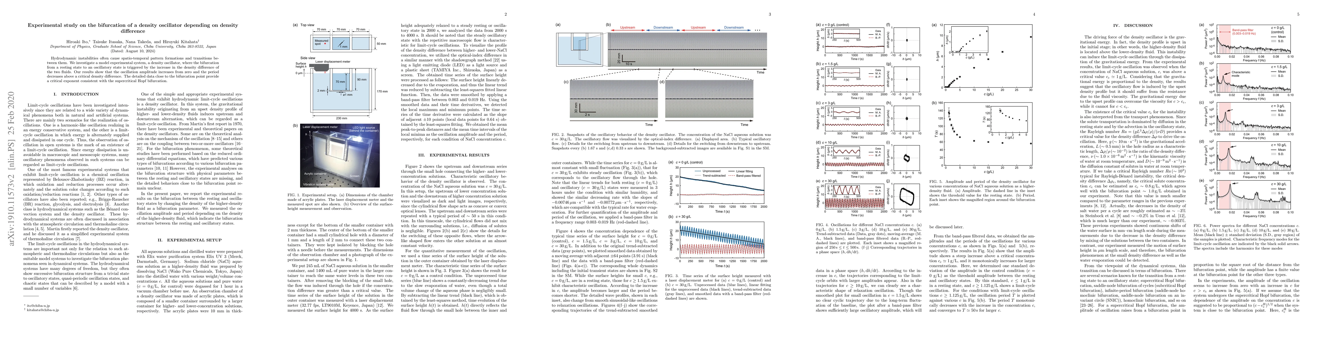 The paper presents detailed experimental data and analysis techniques for characterizing the bifurcation behavior of a density oscillator, including the determination of critical exponents and the identification of a supercritical Hopf bifurcation.