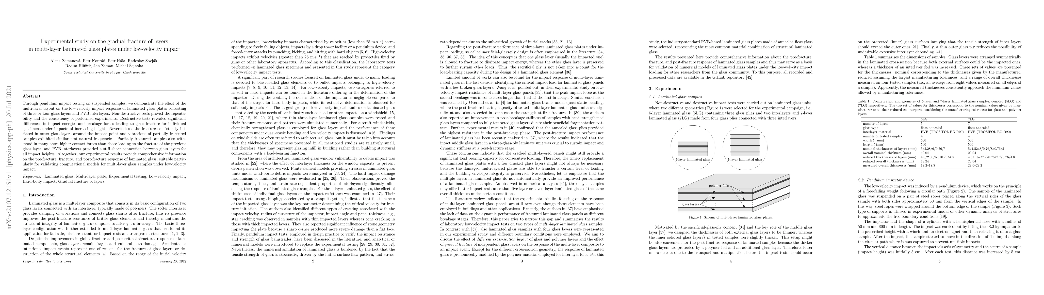 Through pendulum impact testing on suspended samples, we demonstrate the effect of the multi-layer layout on the low-velocity impact response of laminated glass plates consisting of three or four glass layers and PVB interlayers. Non-destructive tests proved the repeatability and the consistency of performed experiments. Destructive tests revealed significant differences in impact energies and breakage forces leading to glass fracture for individual specimens under impacts of increasing height. Nevertheless, the fracture consistently initiated in outer glass layers around the impact point and vibrations of partially fractured samples exhibited similar first natural frequencies. Partially fractured samples also withstood in many cases higher contact forces than those leading to the fracture of the previous glass layer, and PVB interlayers provided a stiff shear connection between glass layers for all impact heights. Altogether, our experimental results provide comprehensive information on the pre-fracture, fracture, and post-fracture response of laminated glass, suitable particularly for validating computational models for multi-layer glass samples under low-velocity impact.