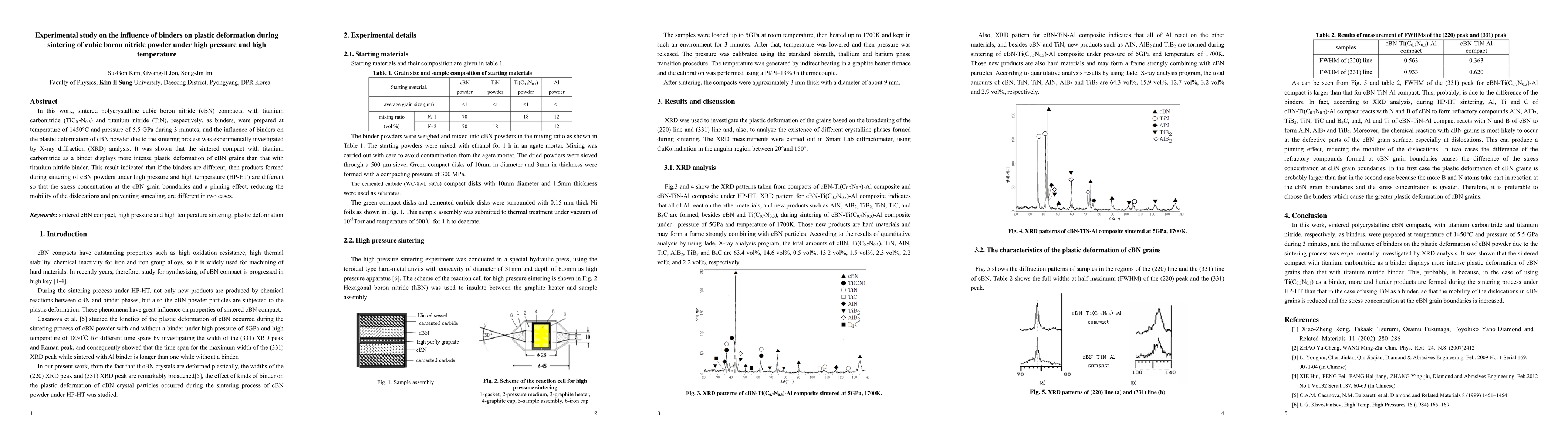 In this work, sintered polycrystalline cubic boron nitride (cBN) compacts, with titanium carbonitride (TiC0.7N0.3) and titanium nitride (TiN), respectively, as binders, were prepared at temperature of 1450{\deg}C and pressure of 5.5 GPa during 3 minutes, and the influence of binders on the plastic deformation of cBN powder due to the sintering process was experimentally investigated by X-ray diffraction (XRD) analysis. It was shown that the sintered compact with titanium carbonitride as a binder displays more intense plastic deformation of cBN grains than that with titanium nitride binder. This result indicated that if the binders are different, then products formed during sintering of cBN powders under high pressure and high temperature (HP-HT) are different so that the stress concentration at the cBN grain boundaries and a pinning effect, reducing the mobility of the dislocations and preventing annealing, are different in two cases.