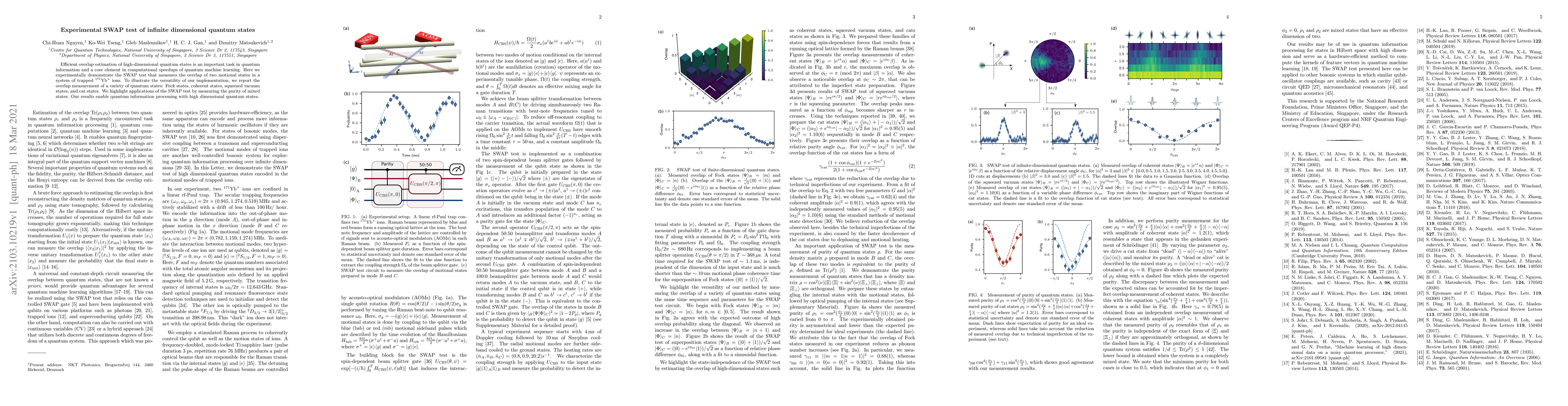 Efficient overlap estimation of high-dimensional quantum states is an important task in quantum information and a core element in computational speedups of quantum machine learning. Here we experimentally demonstrate the SWAP test that measures the overlap of two motional states in a system of trapped $^{171}\mathrm{Yb}^+$ ions. To illustrate the versatility of our implementation, we report the overlap measurement of a variety of quantum states: Fock states, coherent states, squeezed vacuum states, and cat states. We highlight applications of the SWAP test by measuring the purity of mixed states. Our results enable quantum information processing with high dimensional quantum states.