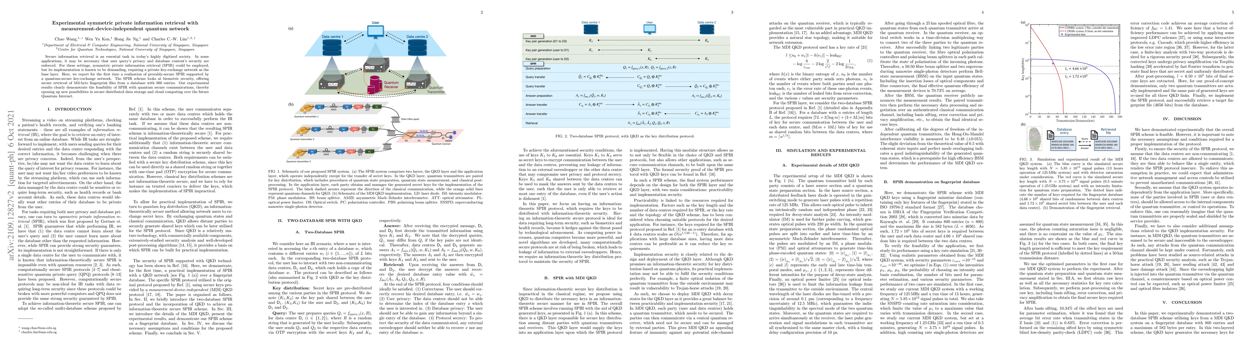 Secure information retrieval is an essential task in today's highly digitised society. In some applications, it may be necessary that user query's privacy and database content's security are enforced. For these settings, symmetric private information retrieval (SPIR) could be employed, but its implementation is known to be demanding, requiring a private key-exchange network as the base layer. Here, we report for the first time a realisation of provably-secure SPIR supported by a quantum-secure key-exchange network. The SPIR scheme looks at biometric security, offering secure retrieval of 582-byte fingerprint files from a database with 800 entries. Our experimental results clearly demonstrate the feasibility of SPIR with quantum secure communications, thereby opening up new possibilities in secure distributed data storage and cloud computing over the future Quantum Internet.