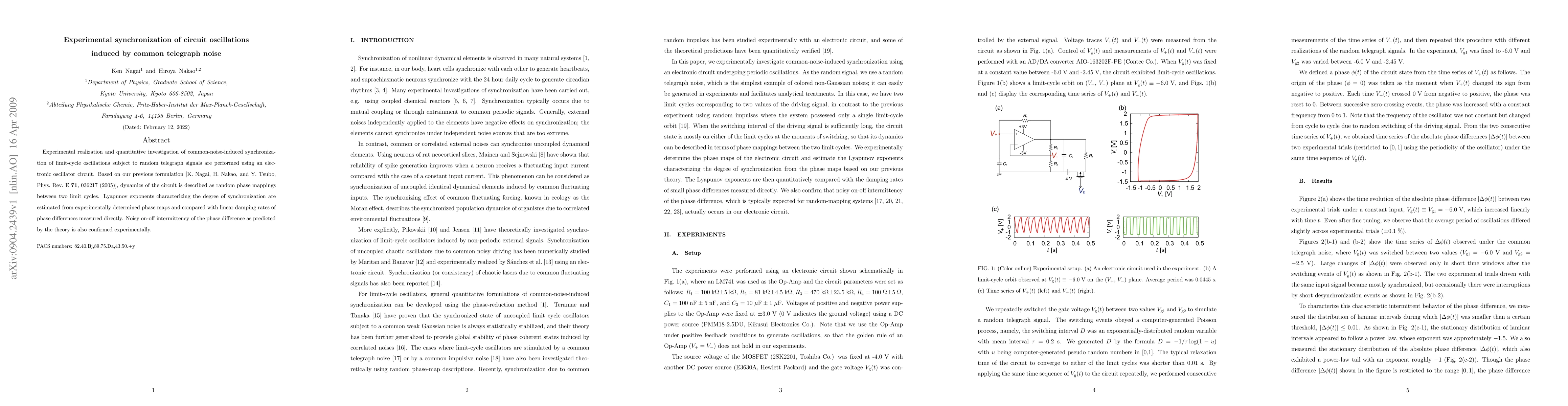 Experimental realization and quantitative investigation of common-noise-induced synchronization of limit-cycle oscillations subject to random telegraph signals are performed using an electronic oscillator circuit. Based on our previous formulation [K. Nagai et al., Phys. Rev. E 71, 036217 (2005)], dynamics of the circuit is described as random-phase mappings between two limit cycles. Lyapunov exponents characterizing the degree of synchronization are estimated from experimentally determined phase maps and compared with linear damping rates of phase differences measured directly. Noisy on-off intermittency of the phase difference as predicted by the theory is also confirmed experimentally.