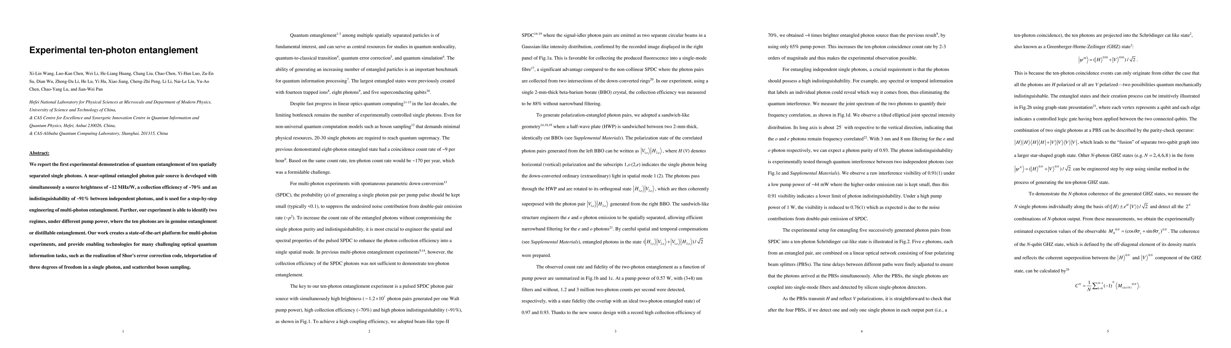 This paper demonstrates the creation of genuine and distillable entanglement among ten single photons using a high-brightness, efficient source, marking a significant advancement in multi-photon quantum information processing and paving the way for complex quantum simulations and error correction.