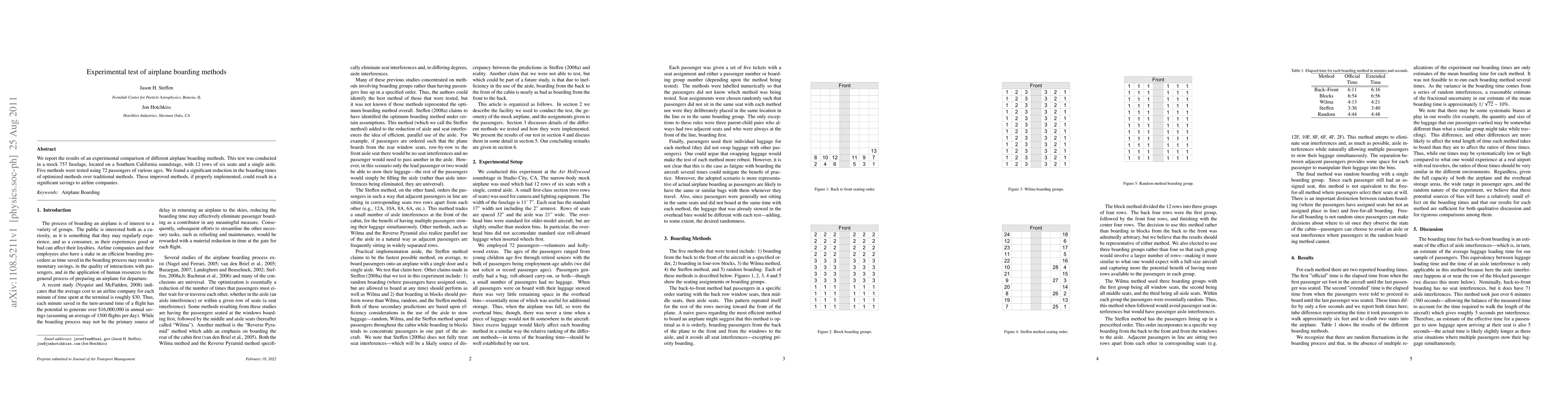 We report the results of an experimental comparison of different airplane boarding methods. This test was conducted in a mock 757 fuselage, located on a Southern California soundstage, with 12 rows of six seats and a single aisle. Five methods were tested using 72 passengers of various ages. We found a significant reduction in the boarding times of optimized methods over traditional methods. These improved methods, if properly implemented, could result in a significant savings to airline companies.