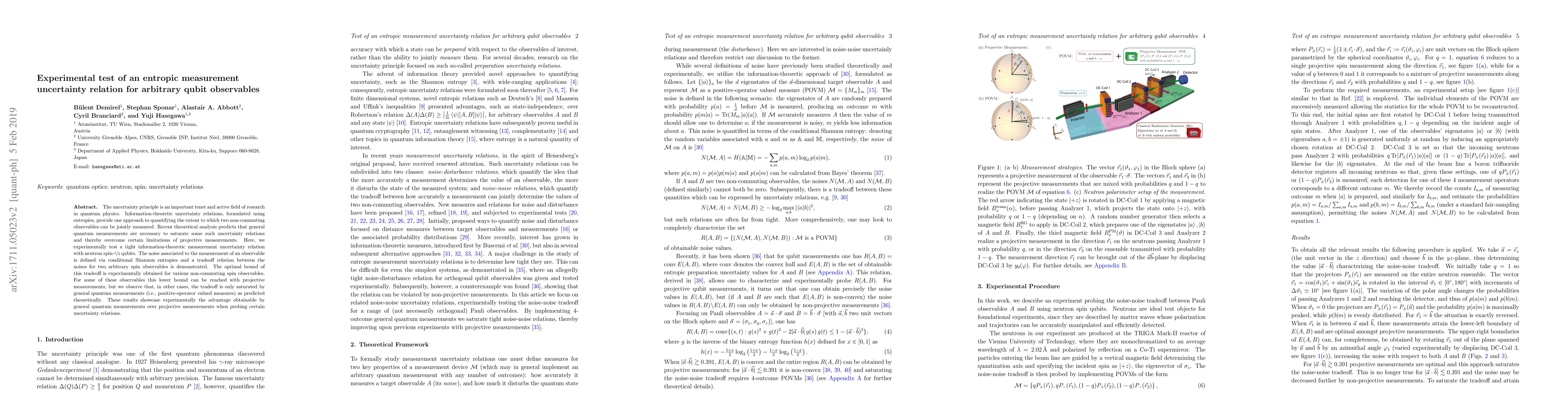 This paper experimentally tests an entropic measurement uncertainty relation for neutron spin-1/2 qubits, demonstrating a tradeoff between measurement noise for arbitrary spin observables. The study finds that while projective measurements can achieve the optimal bound for some observables, general quantum measurements are required for others, aligning with theoretical predictions.