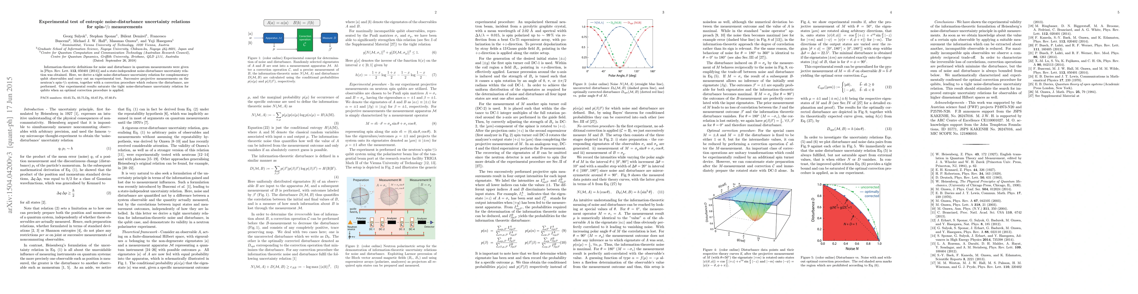 This paper derives and experimentally tests a tight noise-disturbance uncertainty relation for complementary spin-1/2 observables using neutron measurements. The results show that an optimal correction procedure can saturate the theoretical relation.