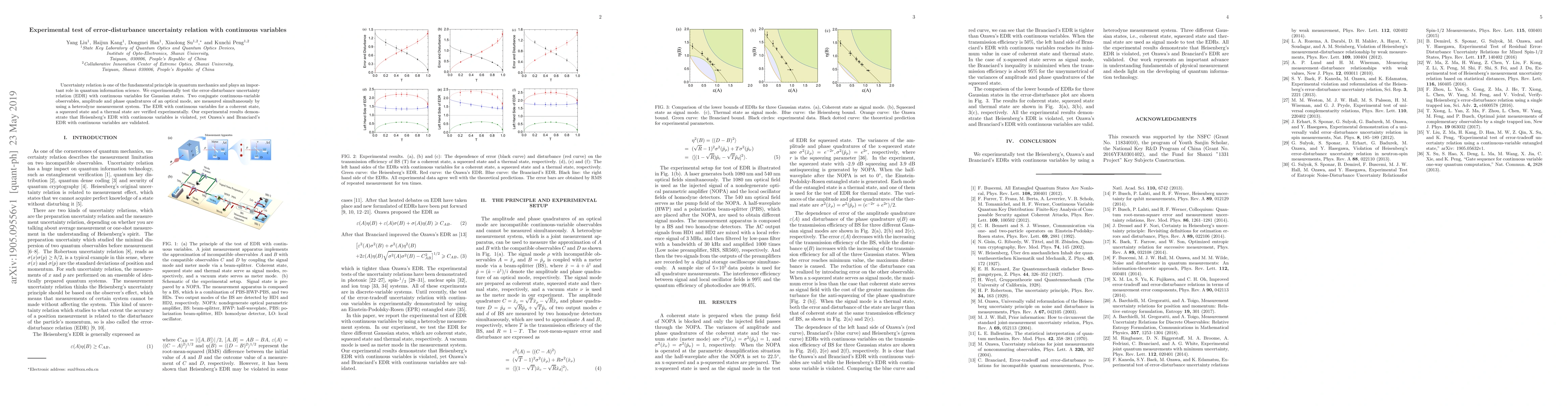 This paper experimentally tests the error-disturbance uncertainty relation (EDR) with continuous variables using Gaussian states. It measures amplitude and phase quadratures of optical modes, demonstrating that Heisenberg's EDR is violated while Ozawa's and Branciard's EDRs hold true.
